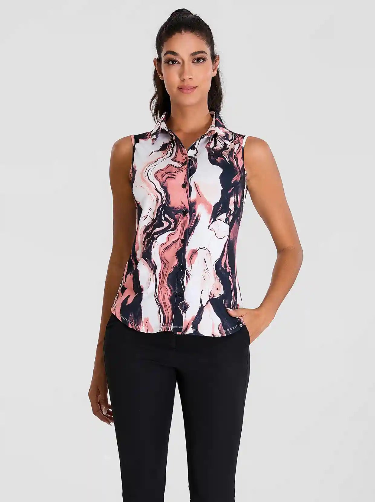 Orange Marble Button-down Sleeveless Golf Polo Shirt for Women