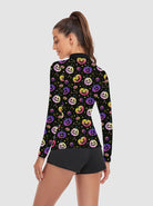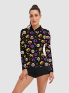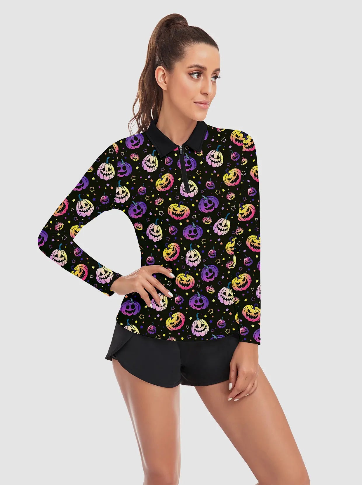 Halloween Fun Pumpkin Pattern Quarter-Zip Long-Sleeve Polo Tops for Ladies