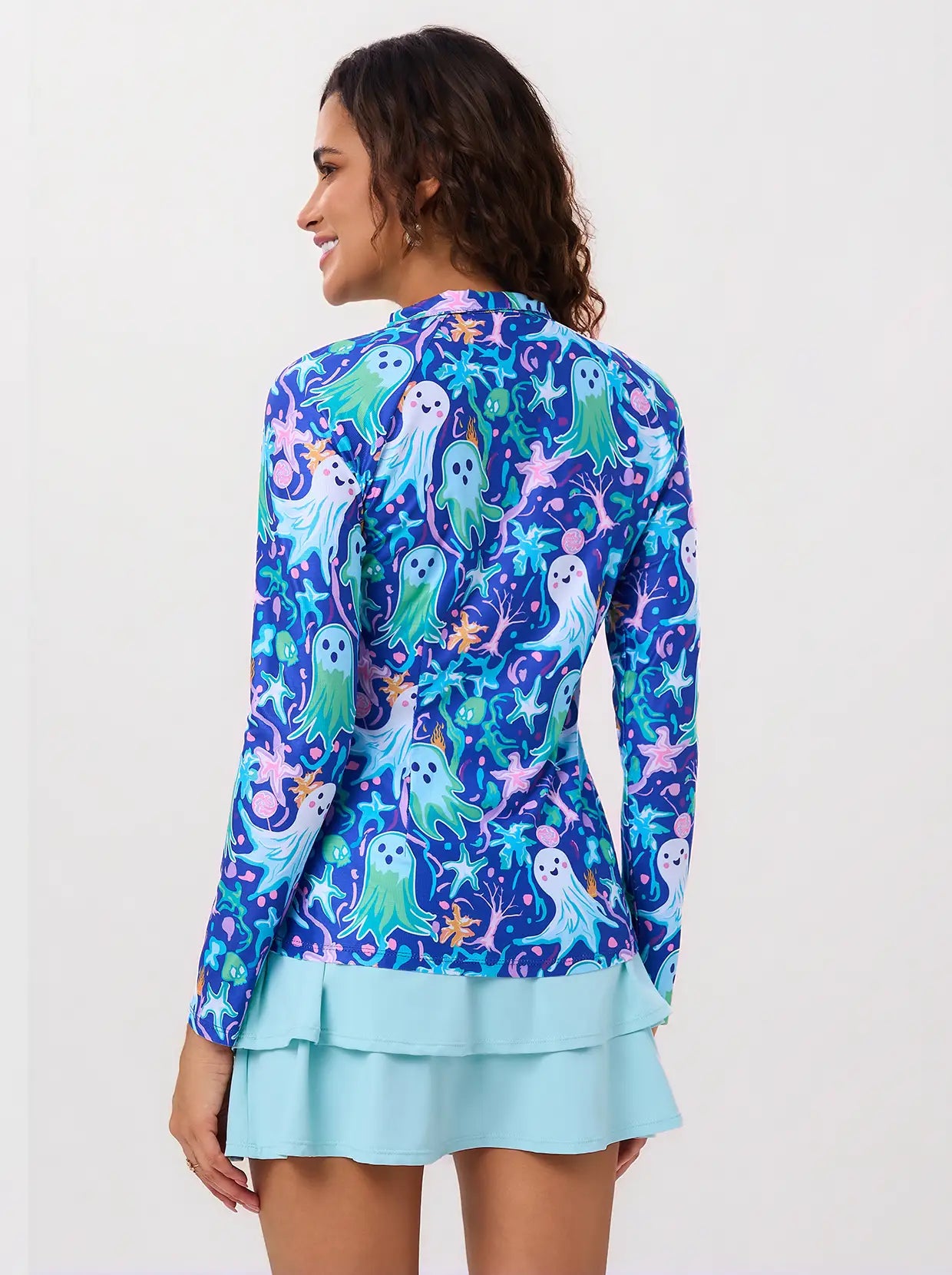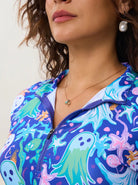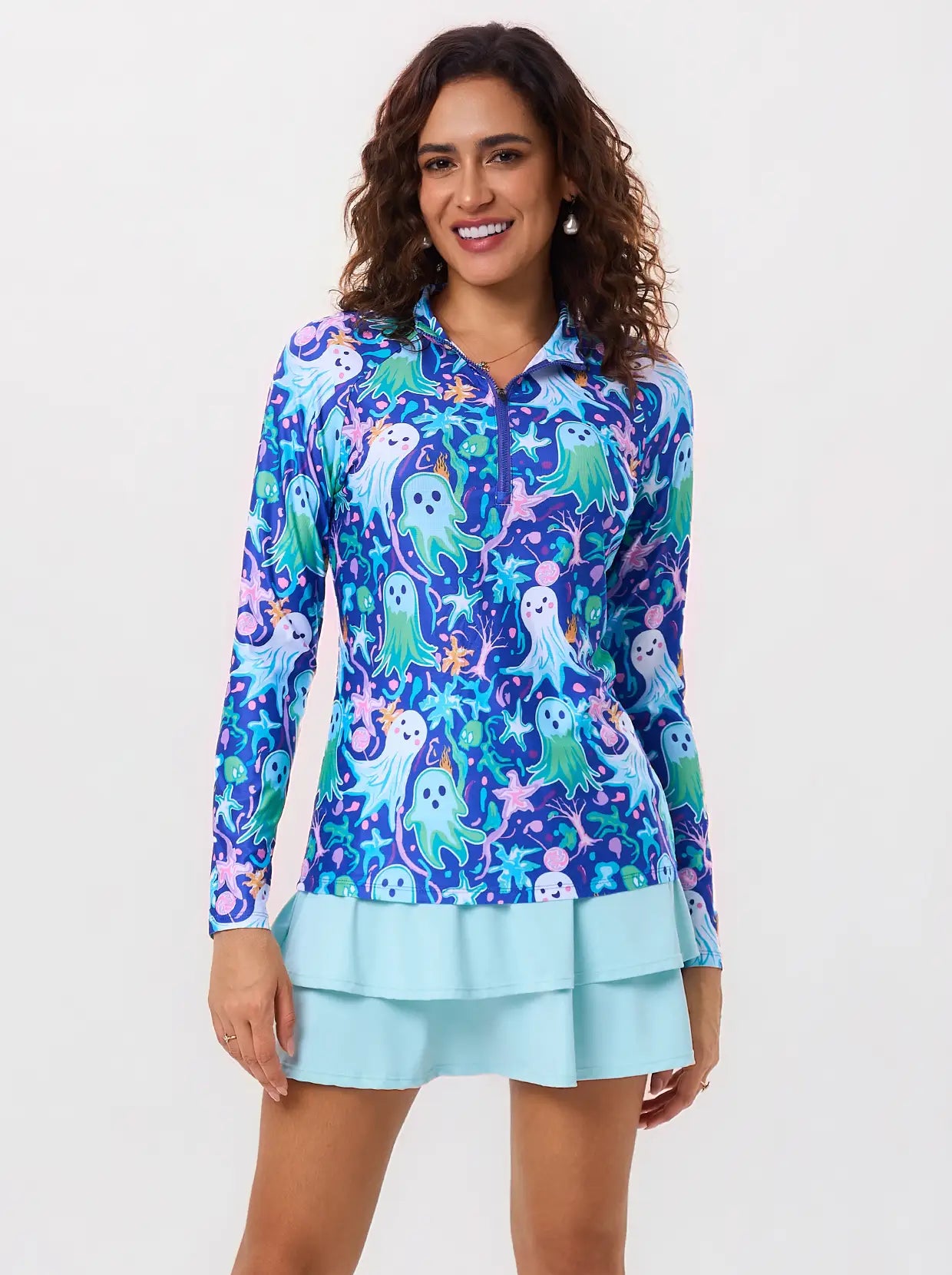 Unleash your inner ghoul with our Ghostly Garden quarter-zip polo shirt. This top features a unique and playful print of smiling ghosts and whimsical Halloween elements, perfect for celebrating the season. Crafted from a soft, breathable, and stretchy fabric, it keeps you cozy and comfortable all day. The quarter-zip design offers versatile styling, while the long sleeves provide just the right amount of coverage for crisp autumn days and haunted nights.