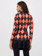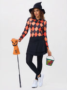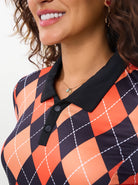 Orange and Black Argyle V-Neck Long Sleeve Polo For Women