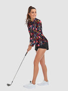Stay stylish and protected with this multi-functional long-sleeve polo. Express your playful side with colorful flower and skull prints on a sleek black background. Made with UPF50+ material, you'll be shielded from UVA and UVB rays while staying cool and dry with its breathable and moisture-wicking fabric. Perfect for golf, pickleball, and Halloween celebrations, this quarter-zip polo offers a streamlined fit and a collared design for a touch of sophistication.