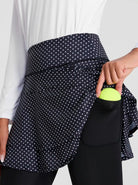 Slip into our White Dot Ruffled Athletic Skirted Leggings and stay active and stylish. Featuring soft, stretchy fabric, our skirted leggings offer unrestricted movement. The double-layer design and longer length provide extra coverage, while side pockets keep your essentials handy. The wide, flat waistband provides a secure and comfortable fit, making them ideal for tennis, pickleball, or casual wear.