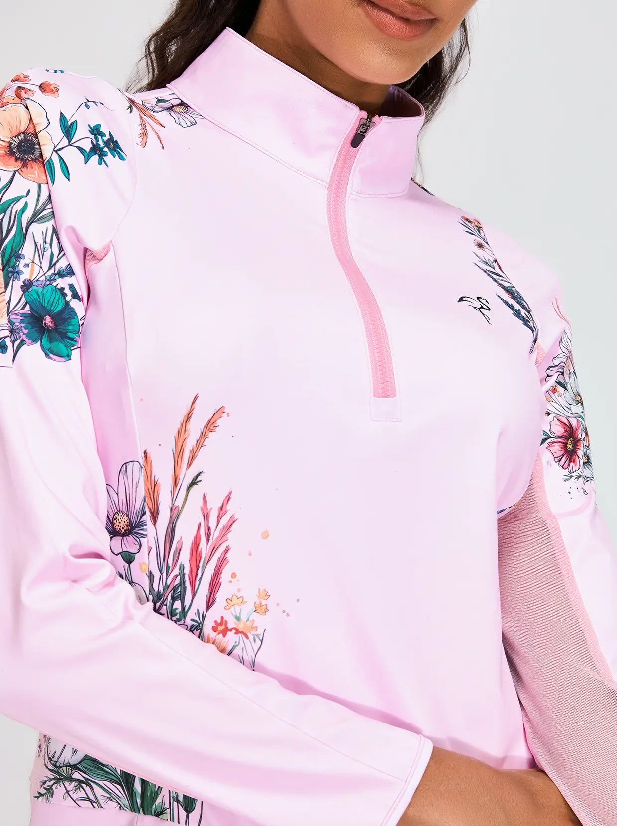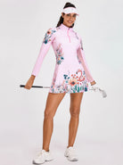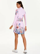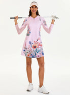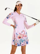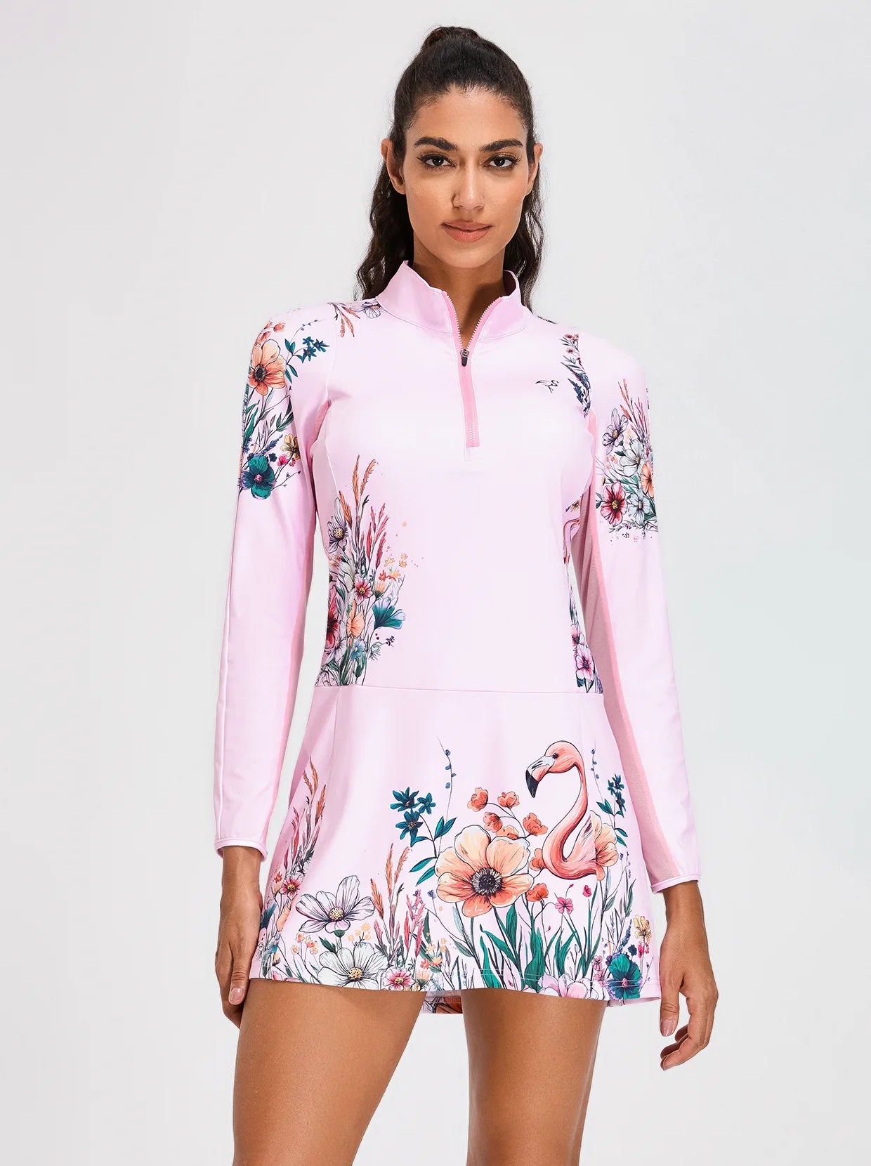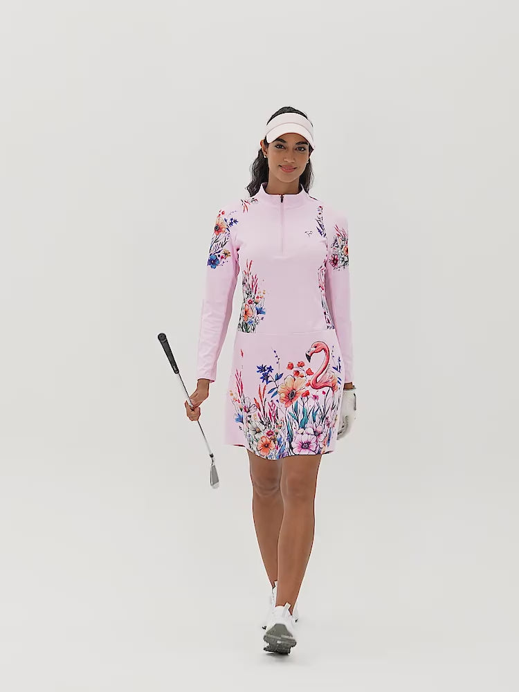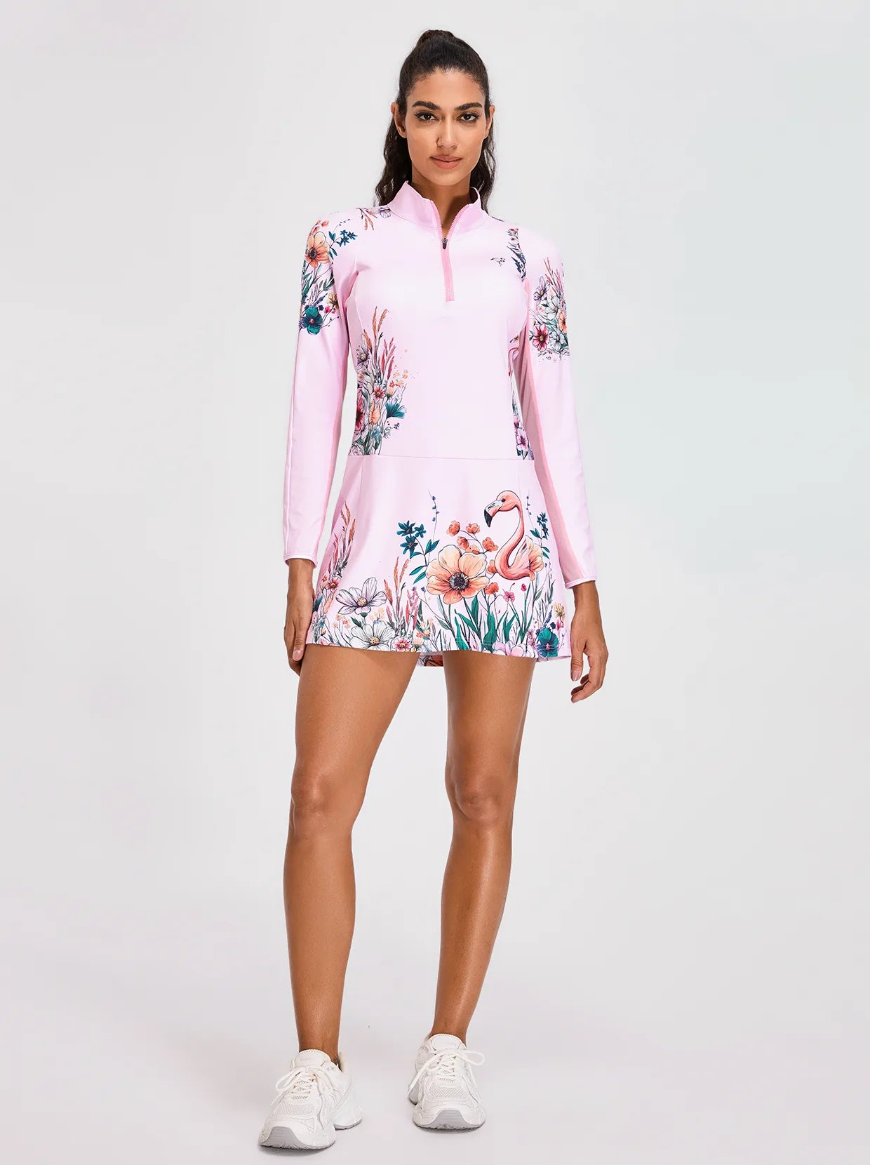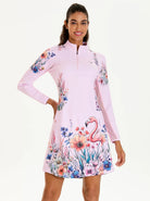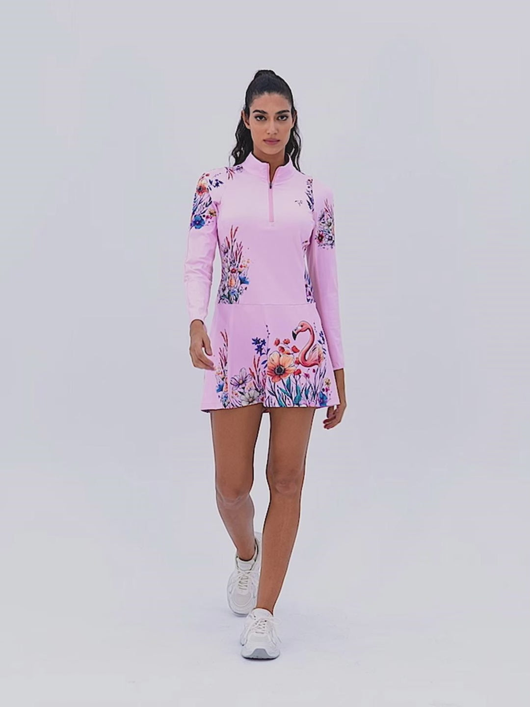 UPF50+ Breathable Pink Flamingo and Floral Quarter-zip 34"/37" Long-sleeve Dress