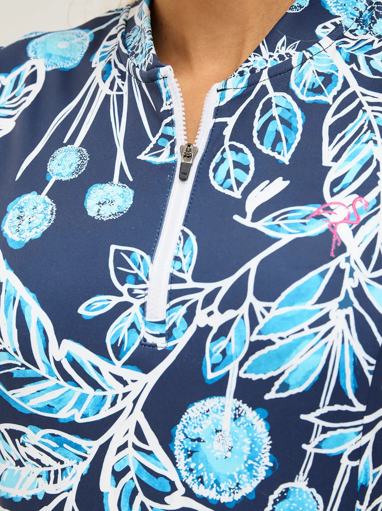 - Blue and white Petal Prelude Pattern with Pink Embroidery Flamingo