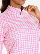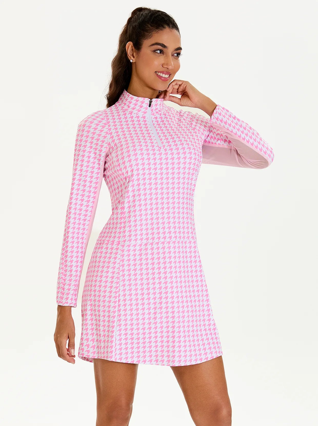 Bye-bye, sweaty arms! Our 34" Houndstooth Quarter-Zip Long-Sleeve Dress features a timeless houndstooth print, offering a sophisticated yet playful look. Made with breathable, soft fabric and 4-way stretch for ultimate comfort. It includes half-mesh sleeves, pockets, and built-in shorts. Perfect for golf, tennis, pickleball, or making an elegant statement in your daily wear.
