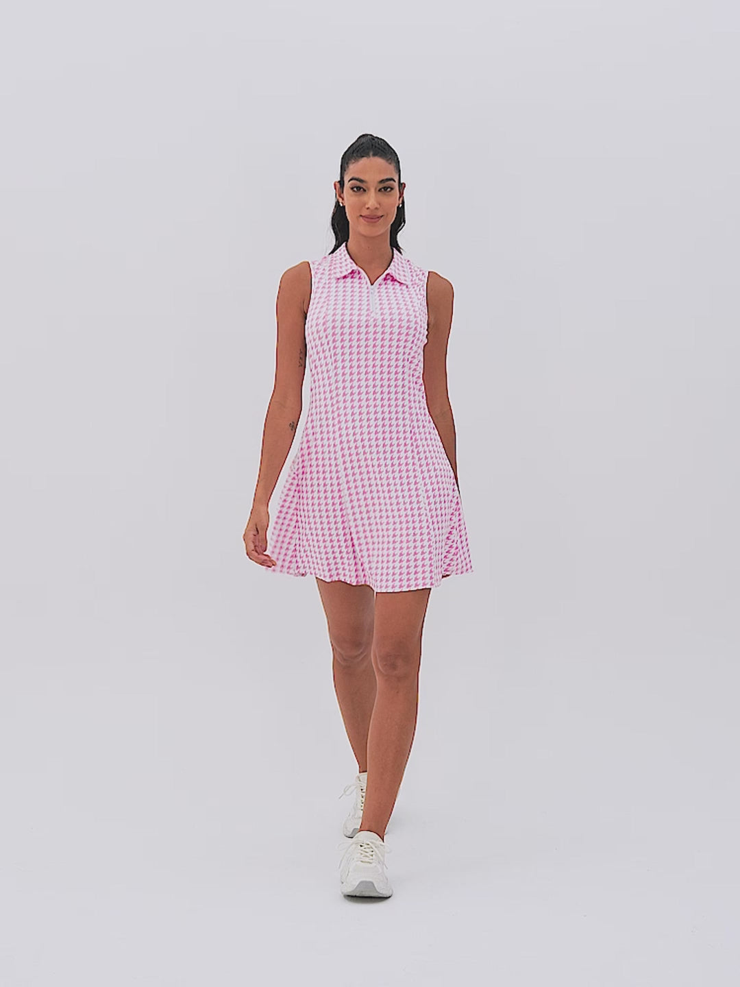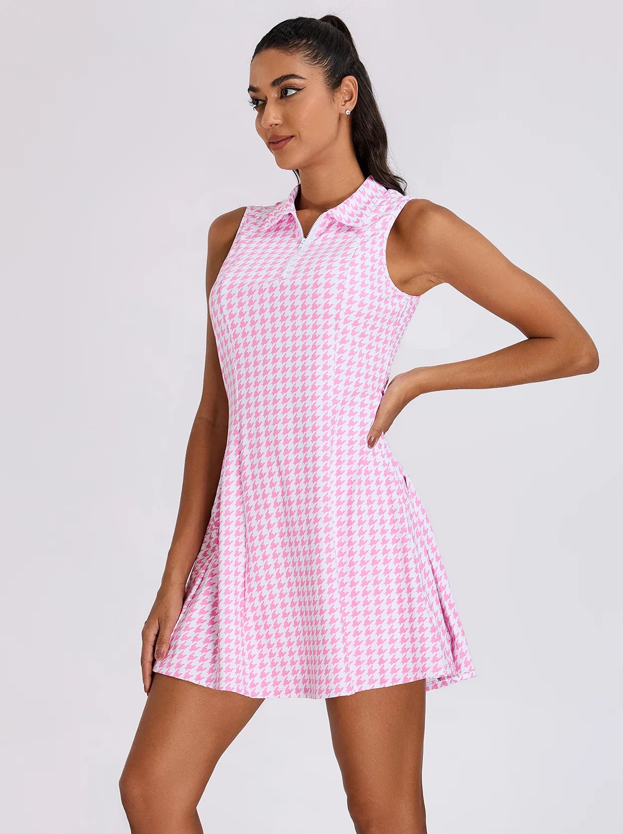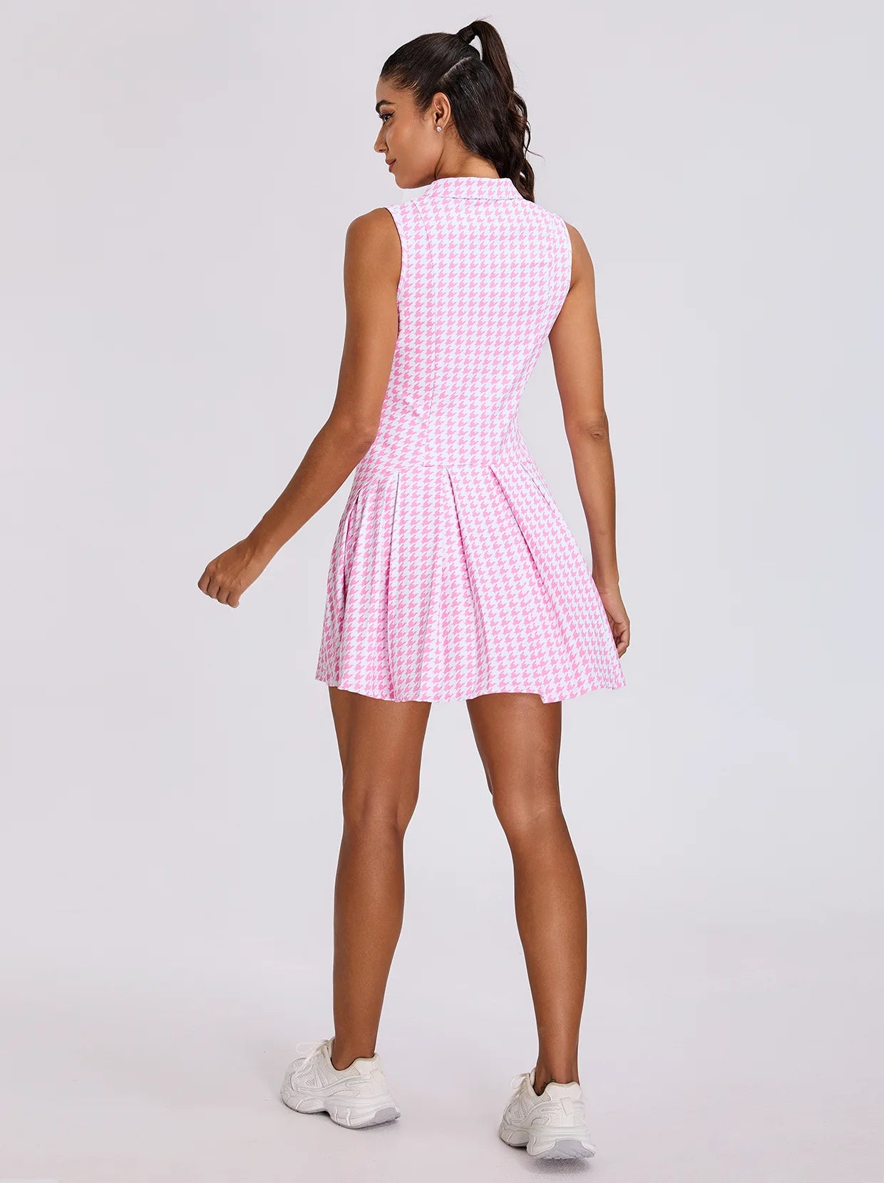 Stay comfortable and stylish with our Pink Houndstooth Quarter-zip Sleeveless Dress. With its 4-way stretch and soft, breathable material, you'll be able to easily move and stay cool while playing golf, tennis, pickleball, or just wearing it for everyday activities. Featuring a classic houndstooth print and a back pleated hem, our golf dress offers a sleek, sporty look. Get ready to turn heads with this must-have addition to your wardrobe.