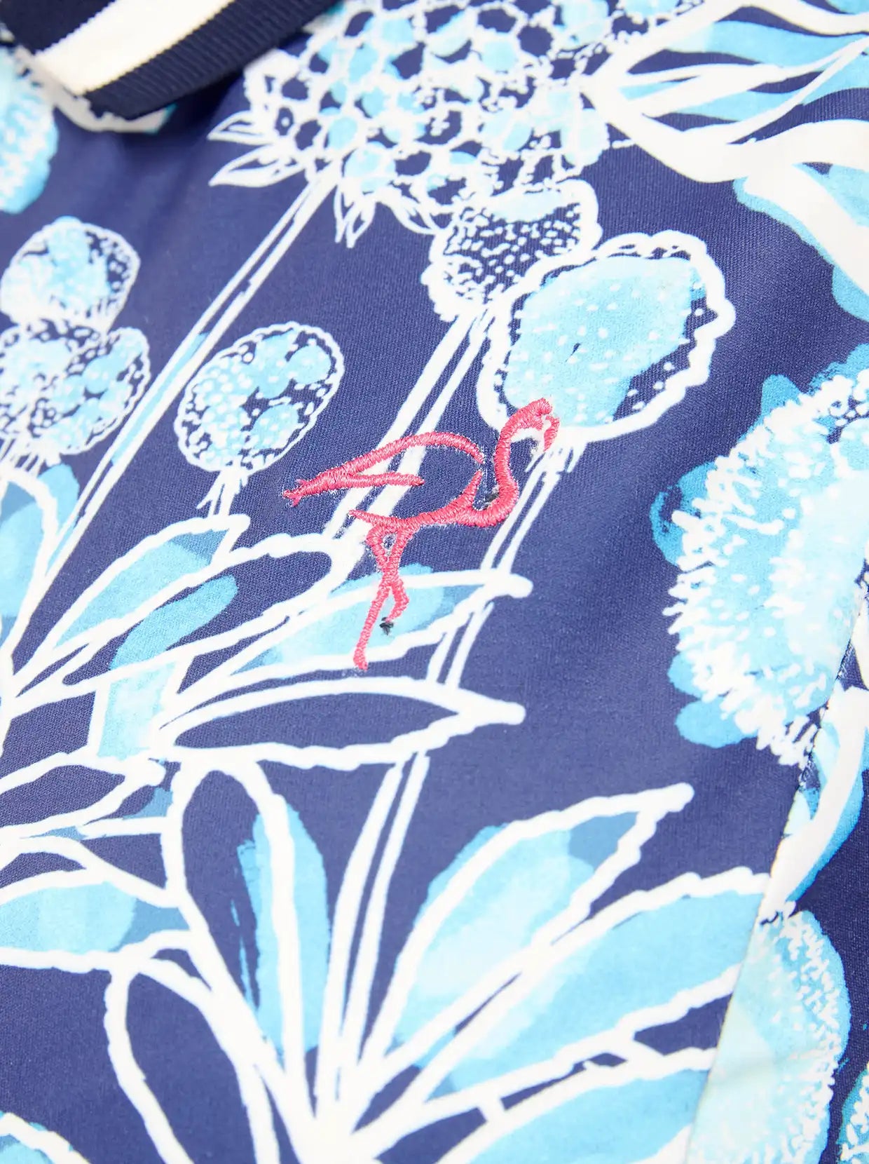- Blue and white Petal Prelude Pattern with Pink Embroidery Flamingo