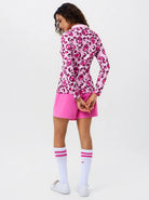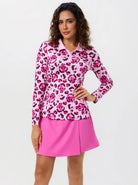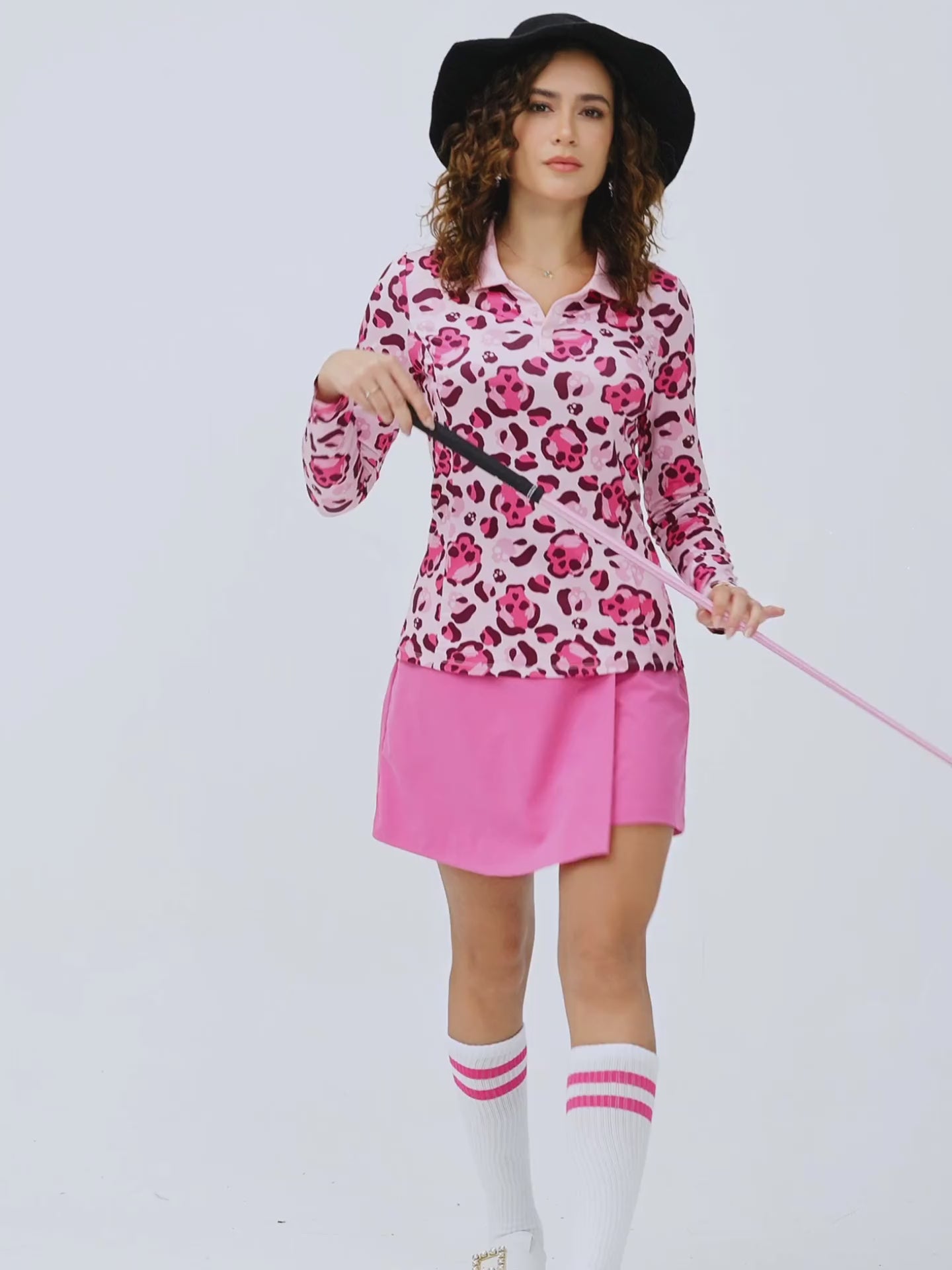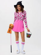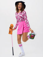 Celebrate Halloween in style with this playful pink skull V-neck polo shirt. Crafted from soft, moisture-wicking, and breathable fabric, it keeps you cool and comfortable for your parties. The 4-way stretch material offers a perfect fit and unrestricted movement, so you can dance, swing, or play your favorite sports with ease. Featuring a playful skull and leopard print, this long-sleeve top adds festive flair to any occasion.