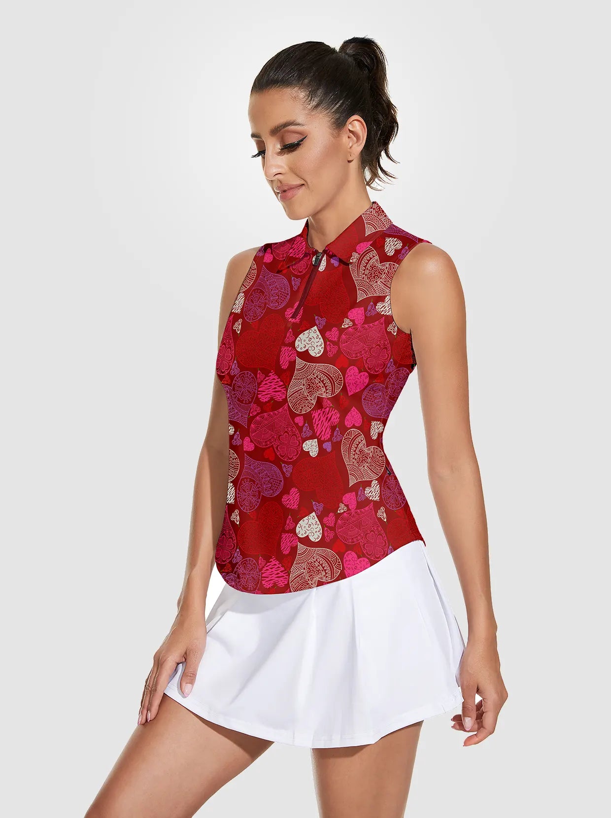 Heart and Floral Print Quarter-zip Sleeveless Polo Shirt For Women