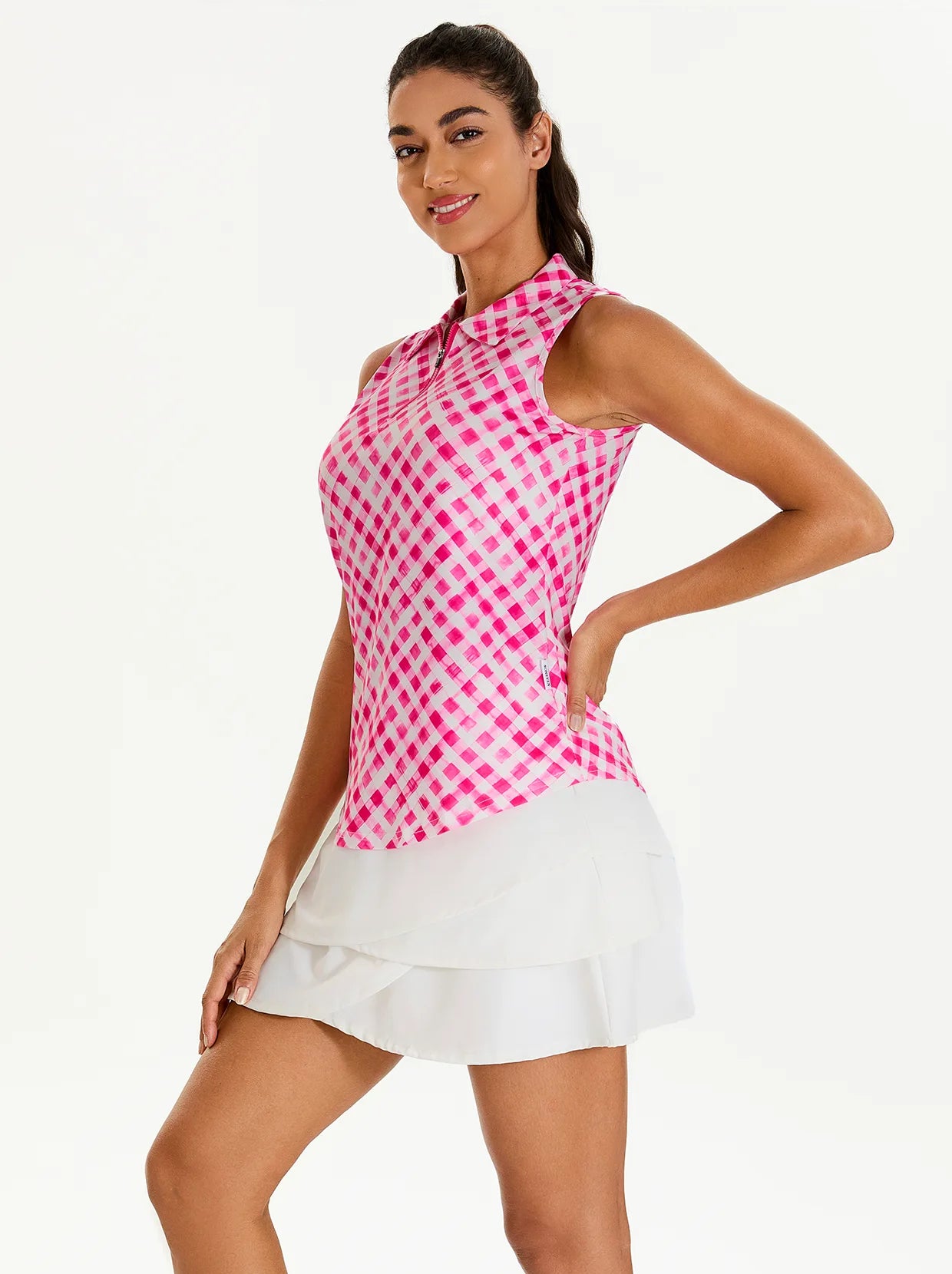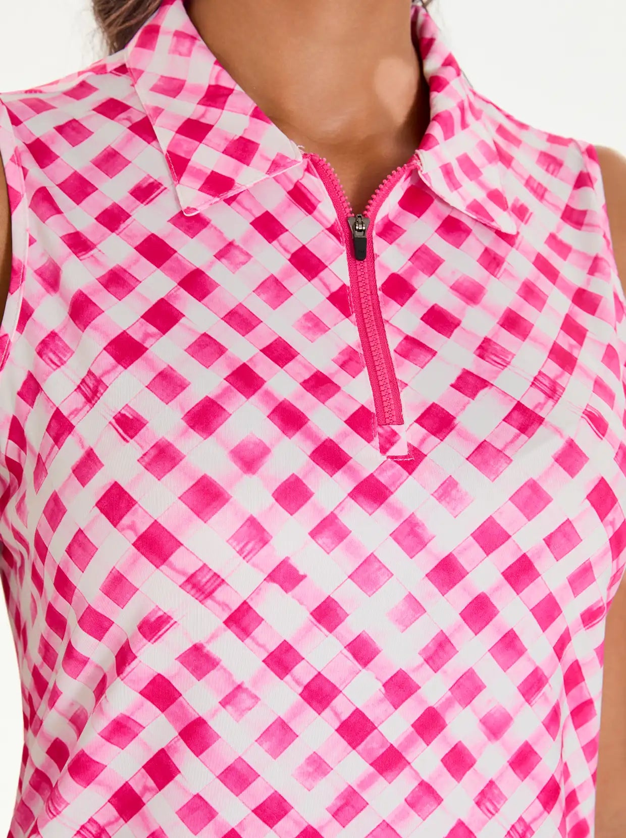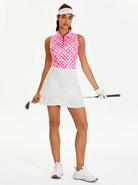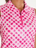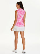Add a pop of style to your activewear with our Pink Checkerboard Sleeveless Polo. This chic top features a modern quarter-zip collar and a classic checkerboard pattern. Crafted from lightweight, breathable, and moisture-wicking fabric with 4-way stretch, it provides exceptional comfort and freedom of movement. The curved hem adds a touch of flair, making it perfect for the golf course, tennis court, or a casual day out.