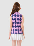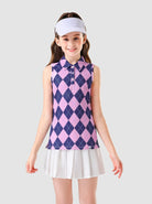 Pink and Blue Checkerboard Button-placket Sleevless Polo Shirt For Girls