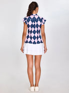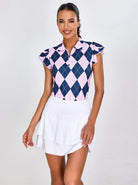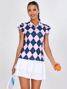 Pink and Blue Checkerboard Quarter-zip Ruffled Short-sleeve Polo Shirt
