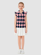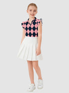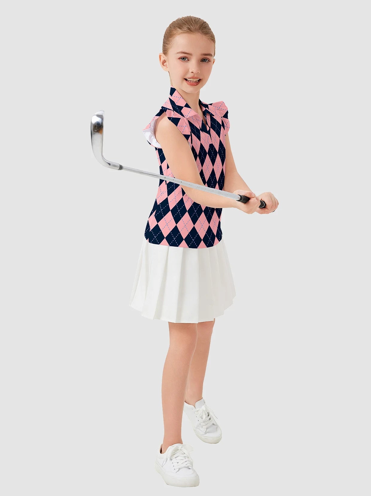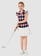 Pink and Blue Checkerboard V-neck Ruffled Sleeveless Polo Shirt for Girls