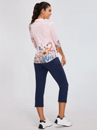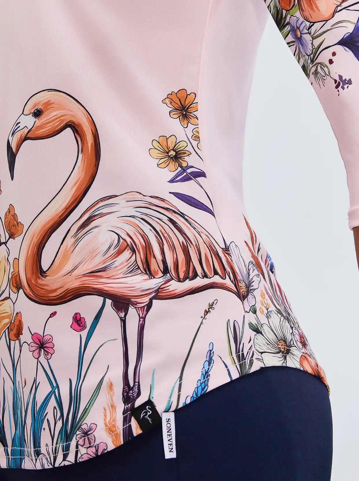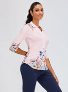 Pink Flamingo and Floral V-neck Button-Down 3/4 Sleeve Polo Shirt