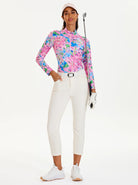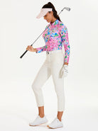 Blossom on the green with our pink floral long-sleeve polo. This beautiful top features raglan sleeves and high-stretch materials, ensuring a full range of motion. Made from lightweight, breathable, and moisture-wicking fabric, it’s designed to keep you cool, dry, and comfortable, whether you're playing a round of golf, a game of tennis, or just enjoying a casual day out.