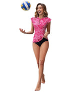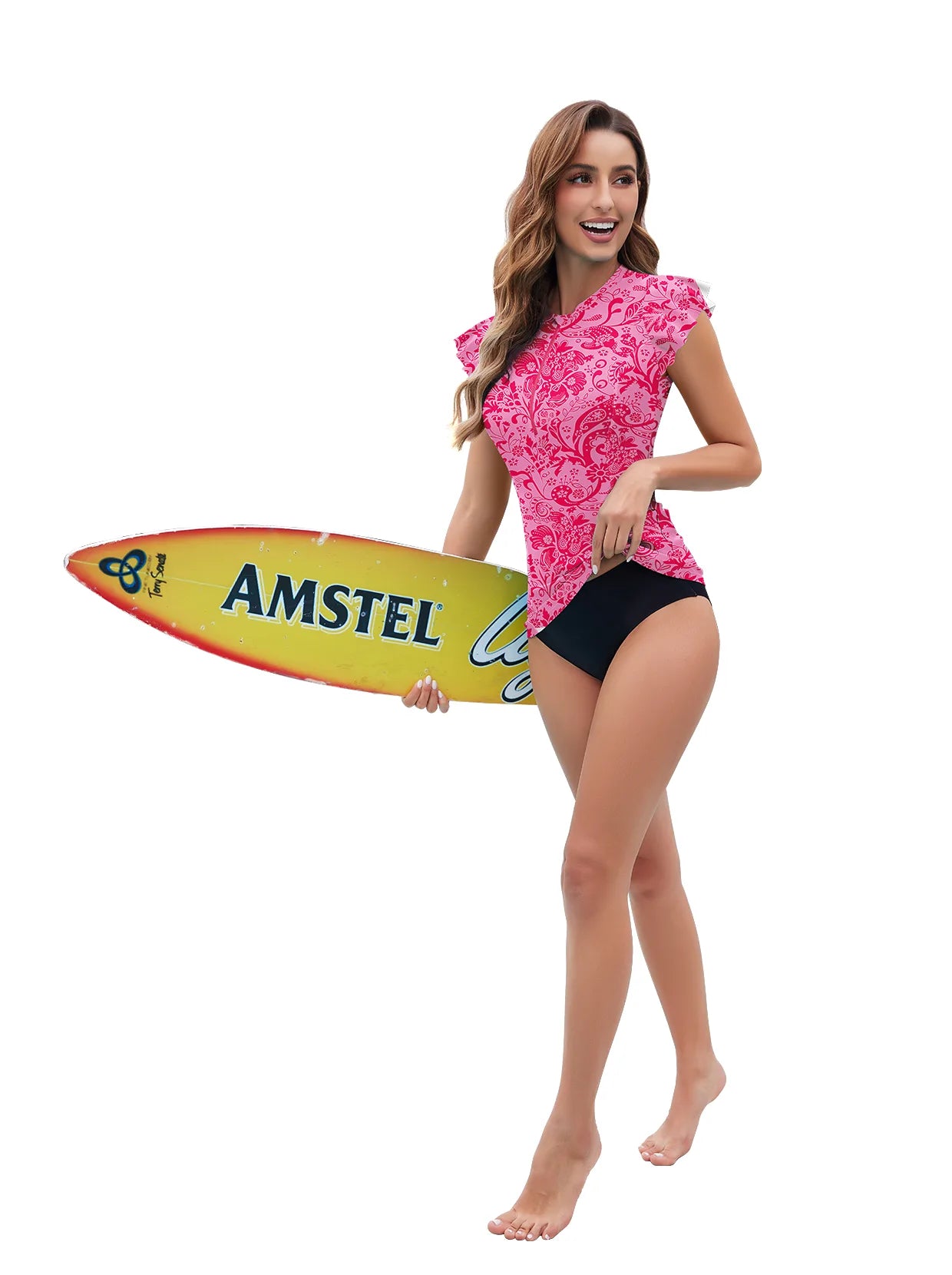 Make the most of your beach time with our Pink Floral Quarter-zip Ruffled Sleeveless Rash Guard. Ideal for surfing or lounging by the shore, this quick-drying, moisture-wicking top with ruffle sleeves and a flattering 1/4 zip V-neck offers both sun protection and chic style.