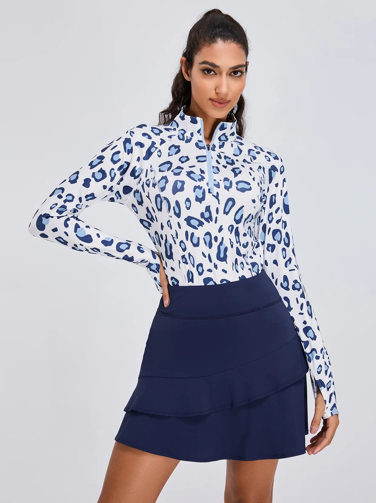 Upgrade your wardrobe with our Blue Leopard Quarter-Zip Long-Sleeve Shirt. This shirt features lightweight, four-way stretch fabric for unrestricted movement. Thumbholes, a stand-up collar, and a quarter-zip design offer extra warmth and protection, while side pockets provide convenient storage. It’s ideal for outdoor activities and casual wear.