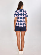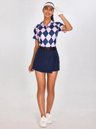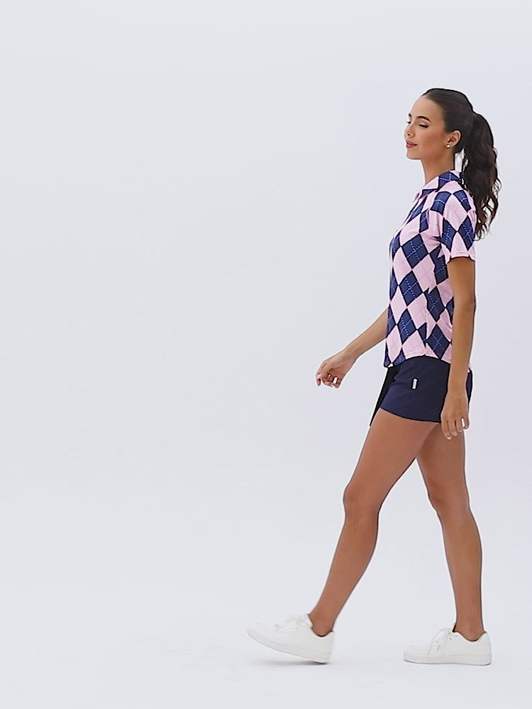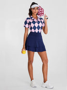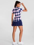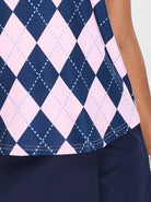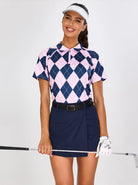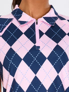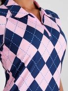 This golf polo features a playful pink and blue checkerboard design with a convenient quarter-zip feature, making it perfect for a round on the course. Stand out from the crowd with this fun and functional top, designed for comfort and style.