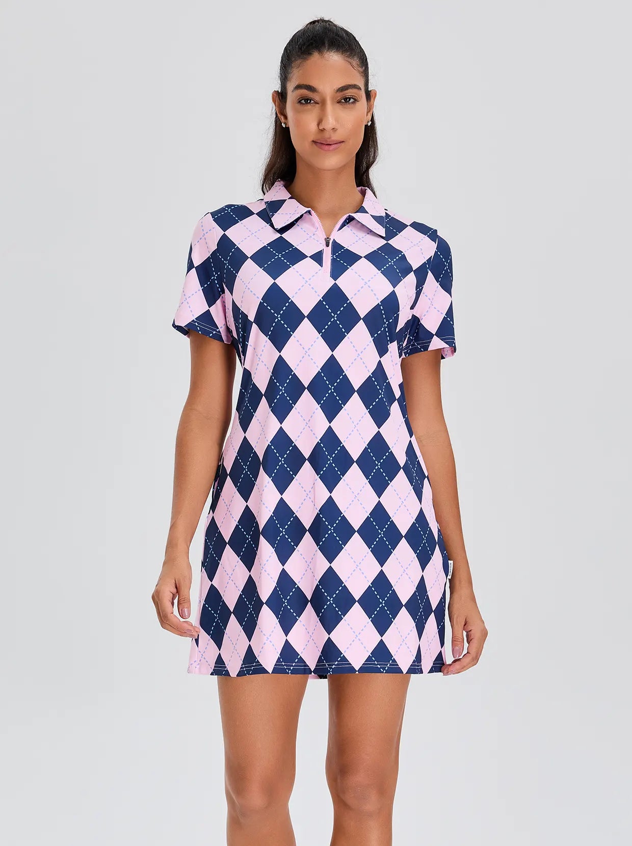33" Pink and Navy Checkerboard Zipper Short-Sleeve Polo Dress with Shorts