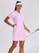 Pink Houndstooth 33" Zipper Short-Sleeve Polo Dress With Inner Shorts