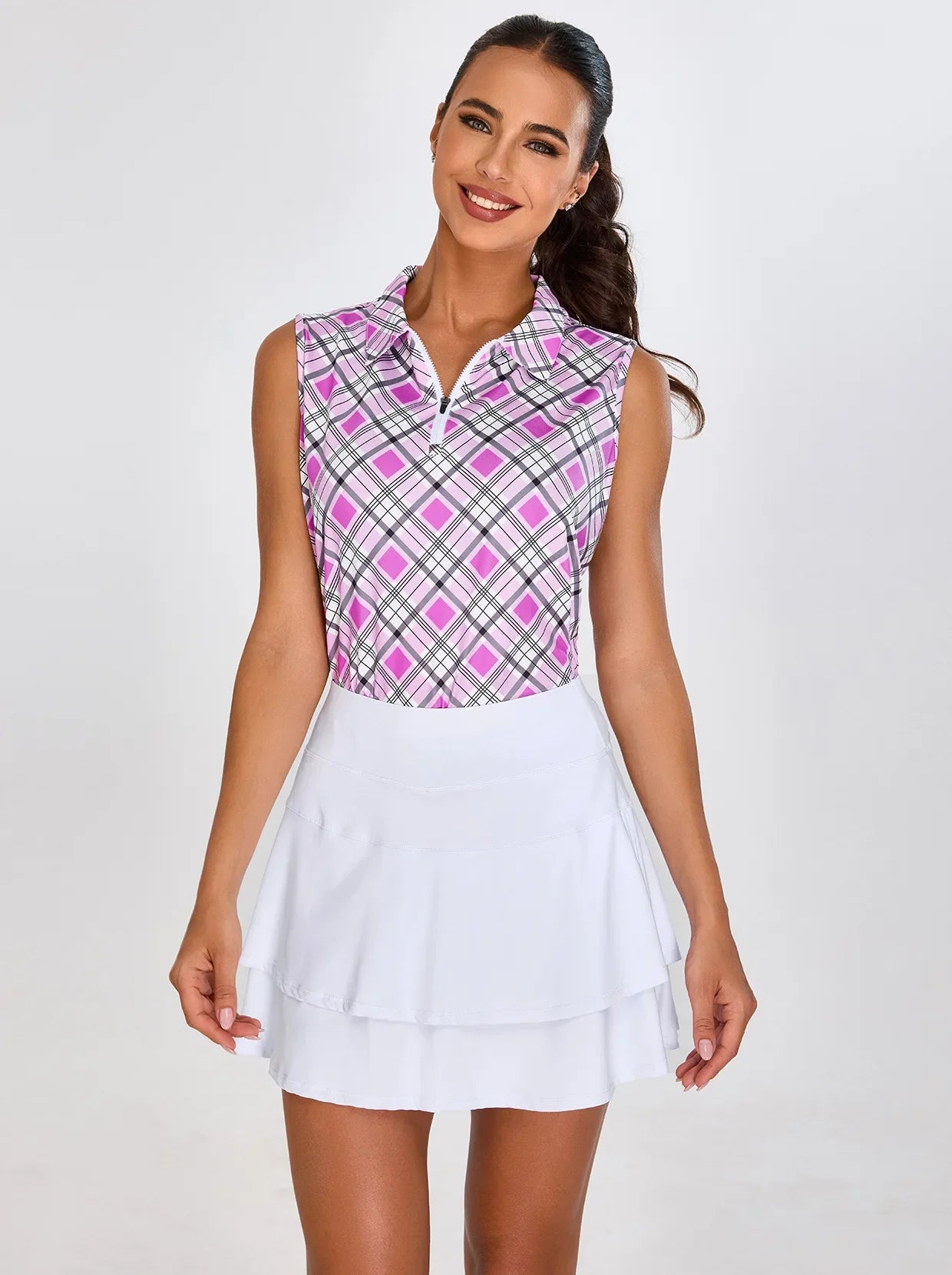 Soneven Ladies Golf Sleeveless Polo-Pink Checkerboard Athletic Polo Shirts Moisture Wicking Tennis Shirts Golf Shirts