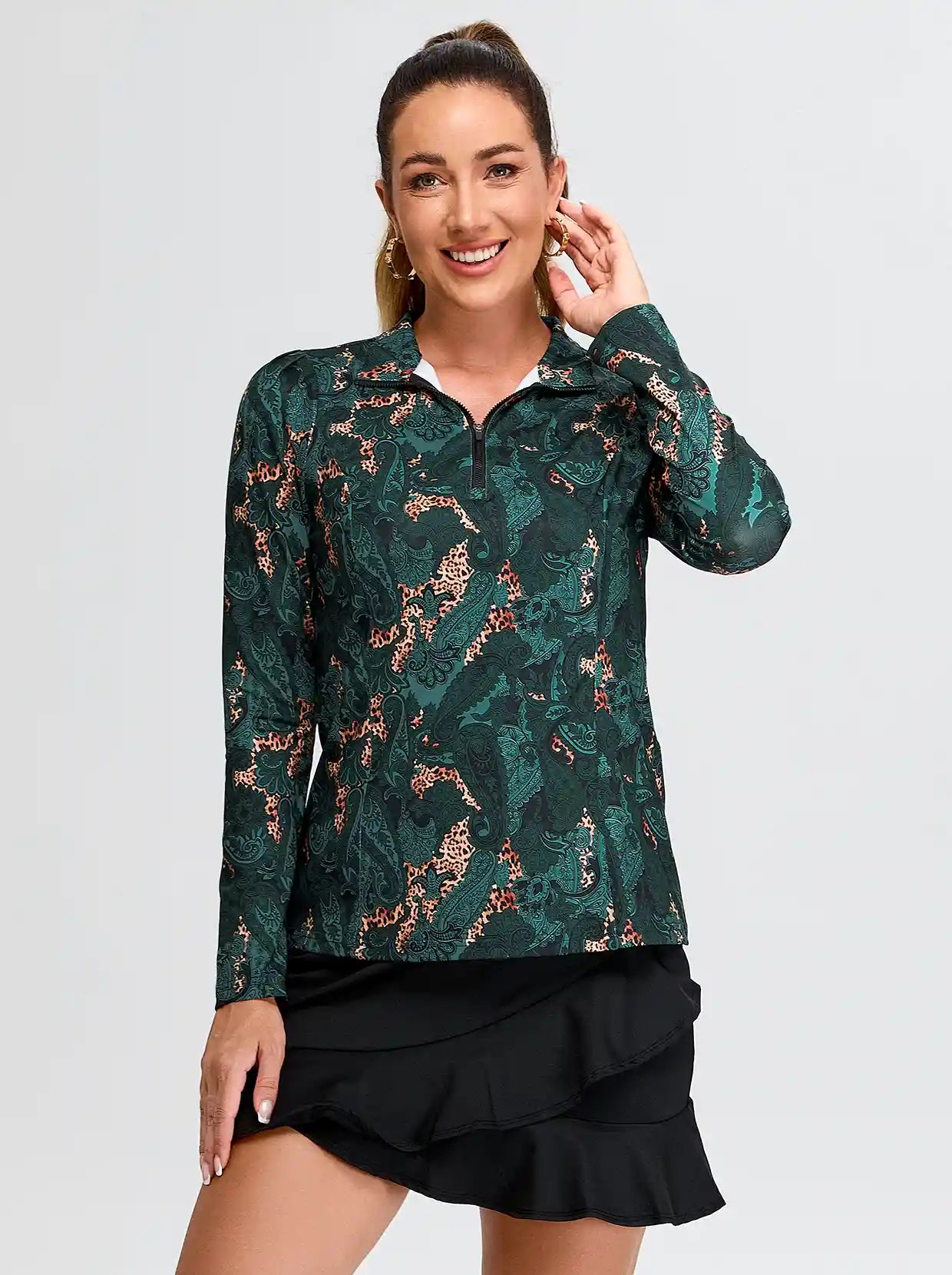 Green Paisley Quarter-zip Long-sleeve Polo Shirt