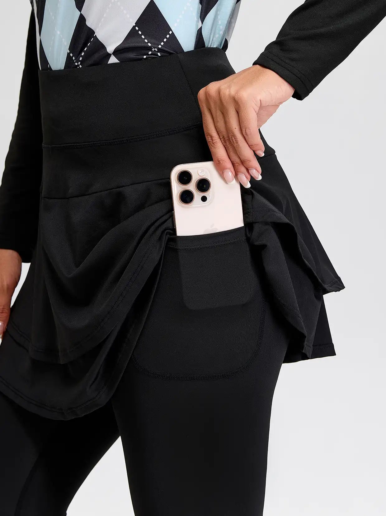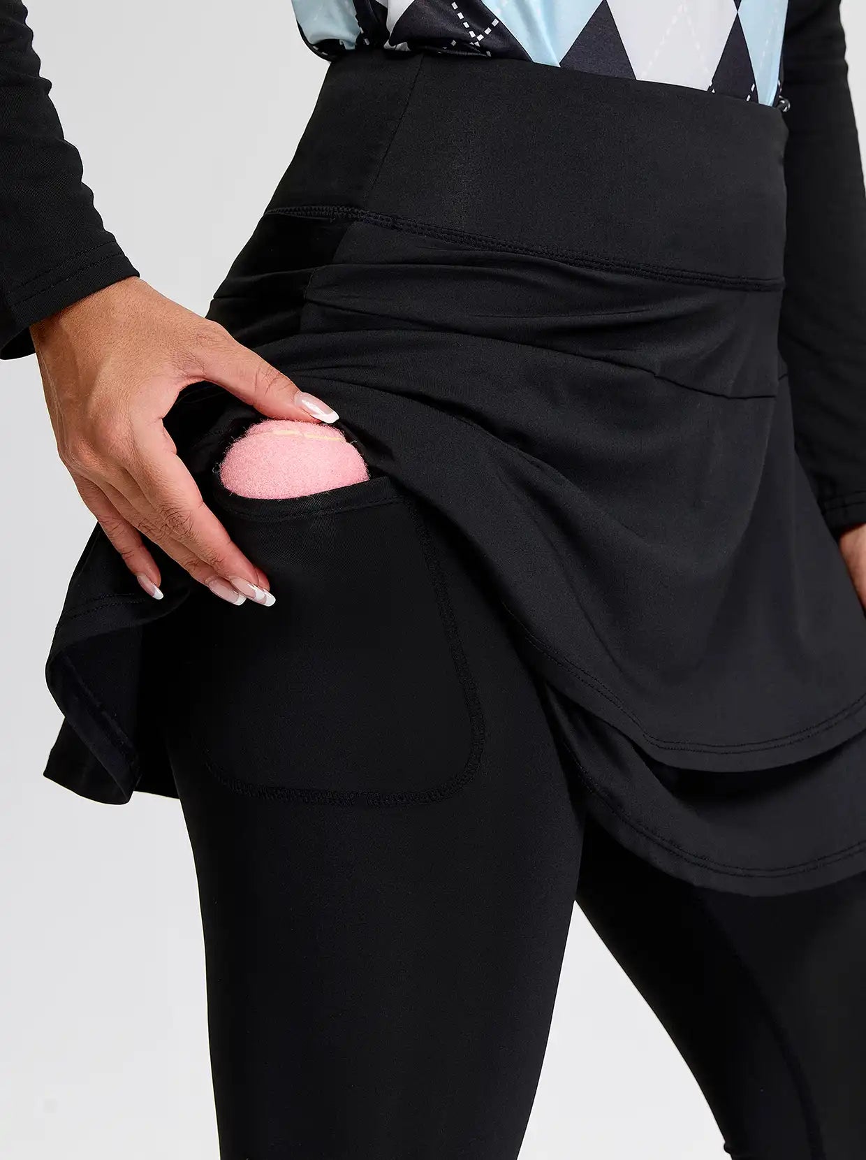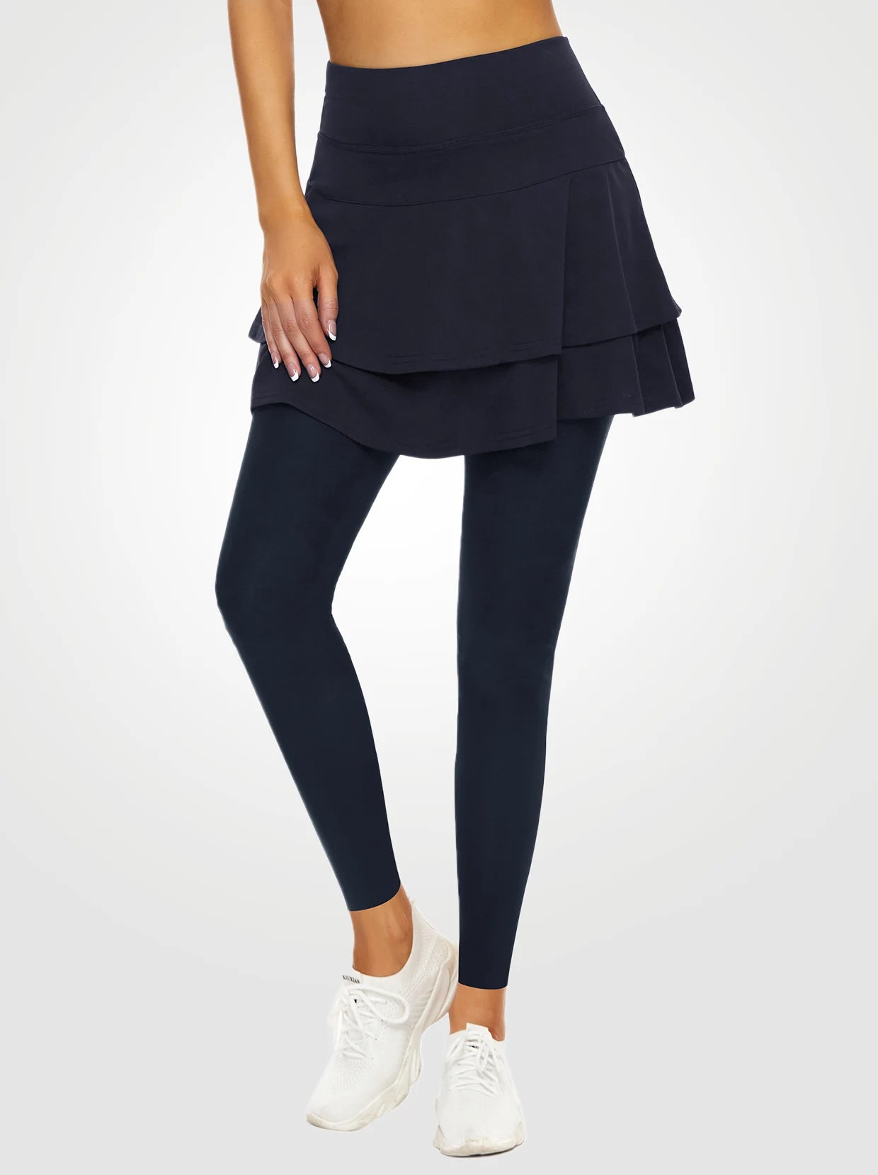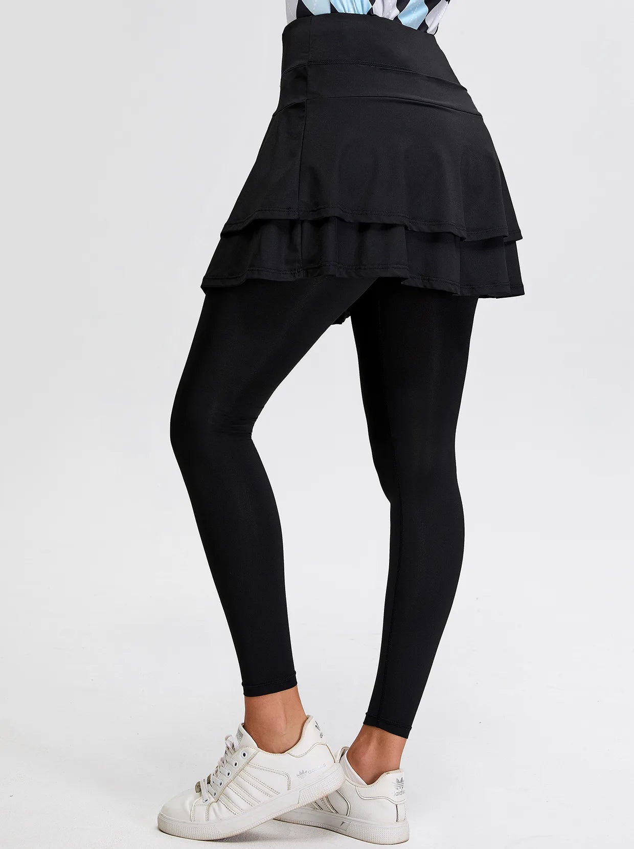 Enjoy your tennis time with our black athletic skirted leggings. Crafted from soft, breathable, and stretchy fabric, these leggings offer superior comfort and moisture-wicking performance. The double layer provides both coverage and flair, while the side pockets keep your essentials within reach. The wide, flat waistband ensures a secure and comfortable fit.
