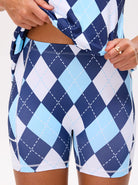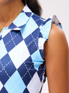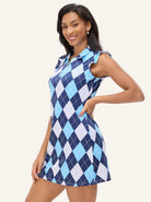 34" Blue Checkerboard Quarter-zip Ruffled Sleeveless Dress with Shorts