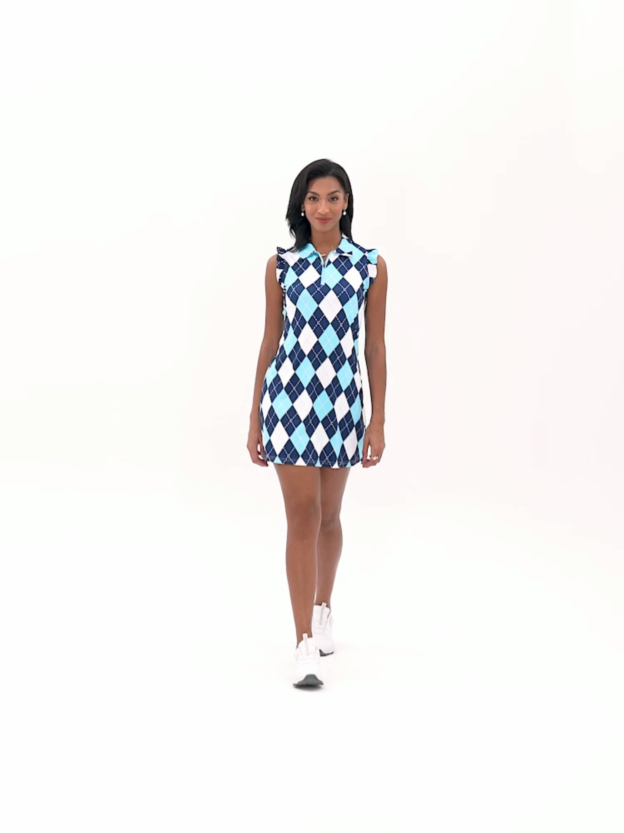 Take your athletic wear game to the next level with our Blue Checkerboard Ruffled Sleeveless Active Dress. The built-in shorts and pockets make it perfect for sports or daily activities, while the moisture-wicking and 4-way stretch material ensure a comfortable fit. Plus, the stylish checkerboard pattern and trendy quarter-zip collar make it a versatile and fashion-forward choice for any occasion. Don't let your clothes hold you back - choose this dress and feel confident and fabulous all day long!