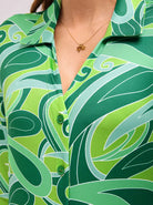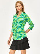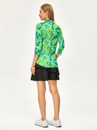 Green Print V-neck Button-Down 3/4 Sleeve Polo Shirt