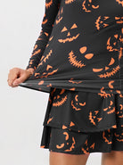 Embrace the Halloween spirit in this playful long-sleeve polo shirt. Featuring a festive Pumpkin Grin Print, this top is perfect for costume parties and seasonal fun. Crafted from a soft, breathable, and stretchy fabric, it keeps you cool and comfortable all day. The 4-way stretch material provides a perfect fit and unrestricted movement, so you can dance or play with ease.