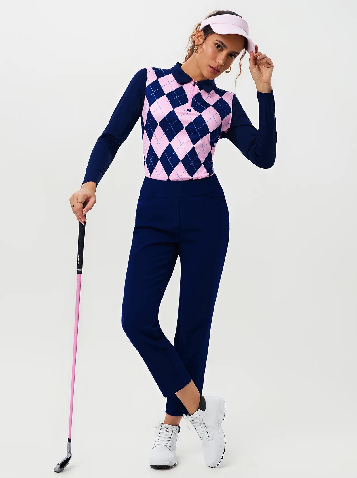 Embrace confidence in this striking blue-and-pink checkerboard polo, thoughtfully designed to support your active lifestyle. The four-way stretch fabric moves seamlessly with you, while advanced moisture-wicking keeps you comfortable through every swing, serve, and stride. Soft and gentle against your skin, the quarter-zip collar and long sleeves provide a polished, put-together look you can rely on.
