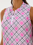 Step into effortless style and comfort with the Pink and White Checkerboard Quarter-Zip Sleeveless Shirt. Its stretch fabric is both breathable and moisture-wicking, adapting to your every move, whether you're on the golf course, tennis court, in the office, or out and about. The sleek collarless quarter-zip not only provides a contemporary look but also keeps you feeling cool and supported from morning to night.