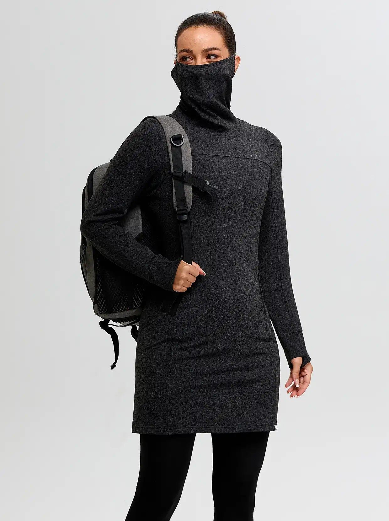 The Cowl Neck Long-Sleeve Fleece Dress blends style and functionality. Made from lining soft fleece, it offers ultimate comfort. Convenient pockets provide easy storage, while thumbholes keep the sleeve in place and provide added warmth. The cowl neck can be looped over the ears to serve as a face mask, keeping out the wind and retaining warmth.