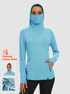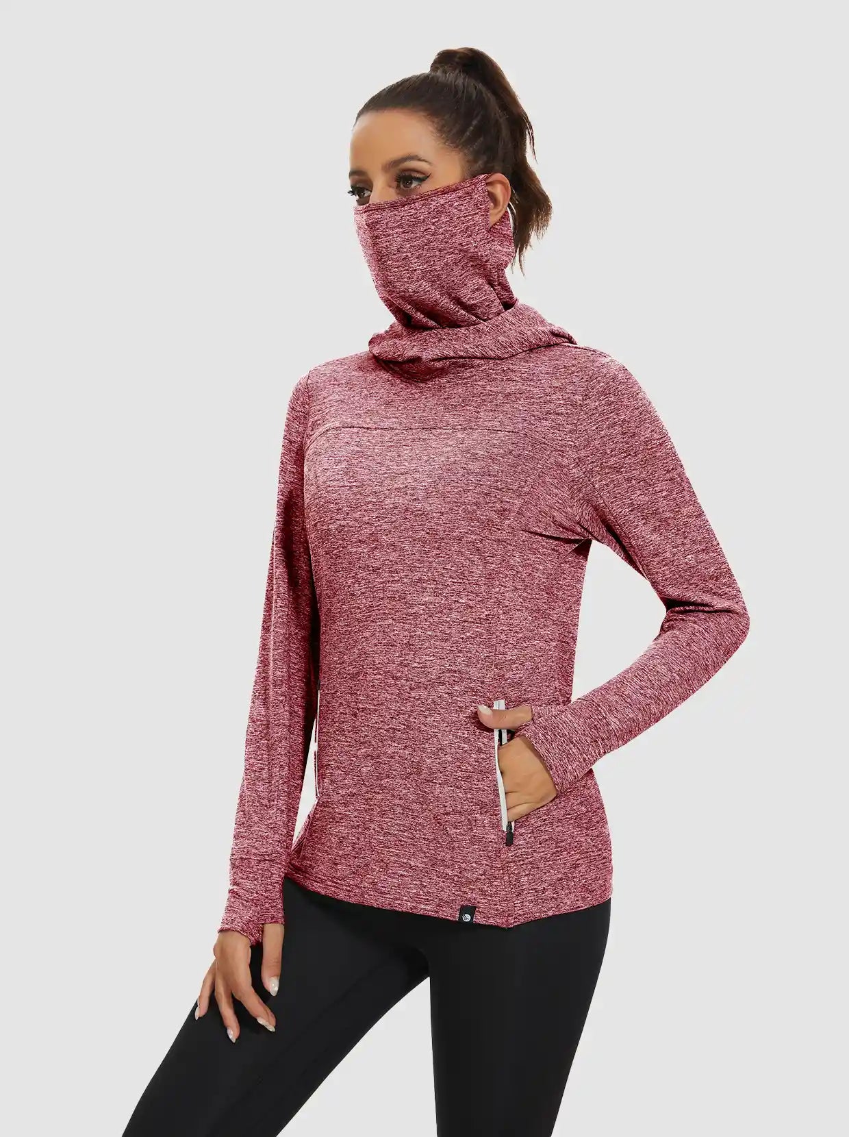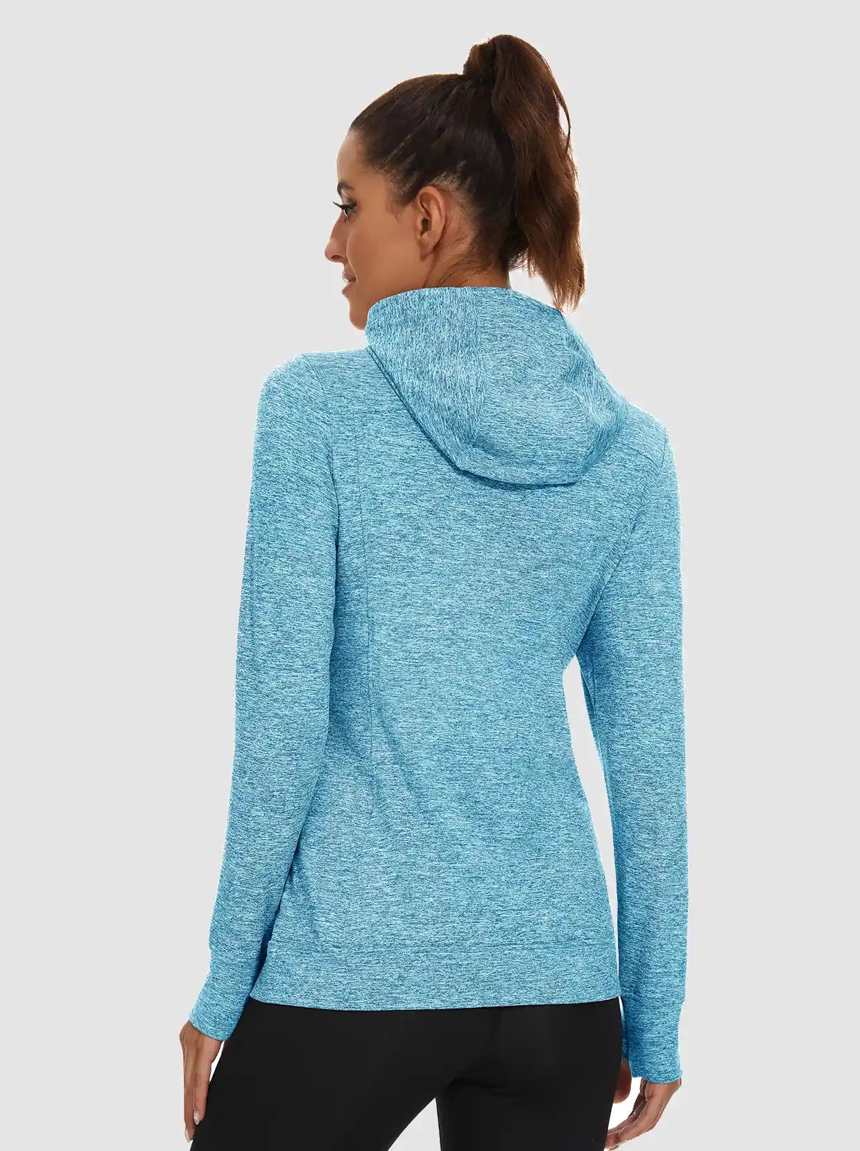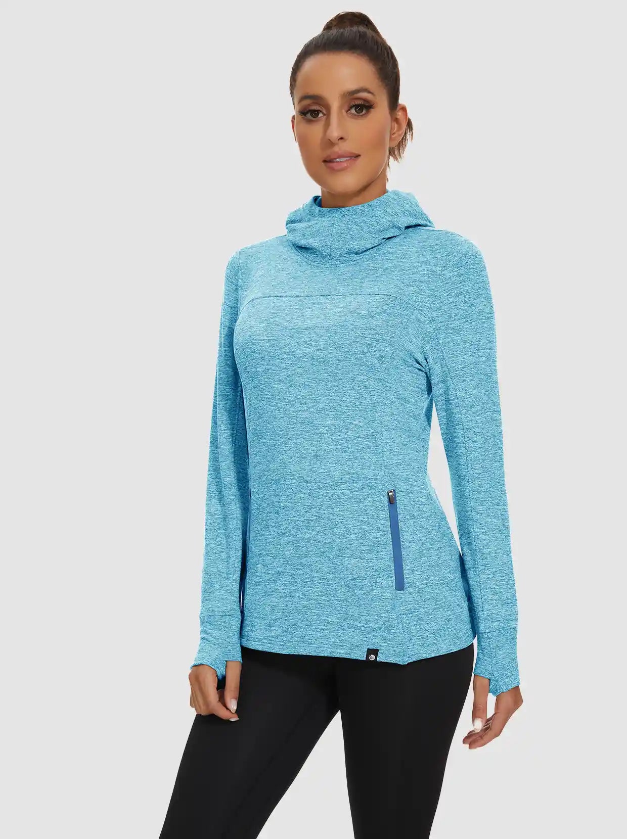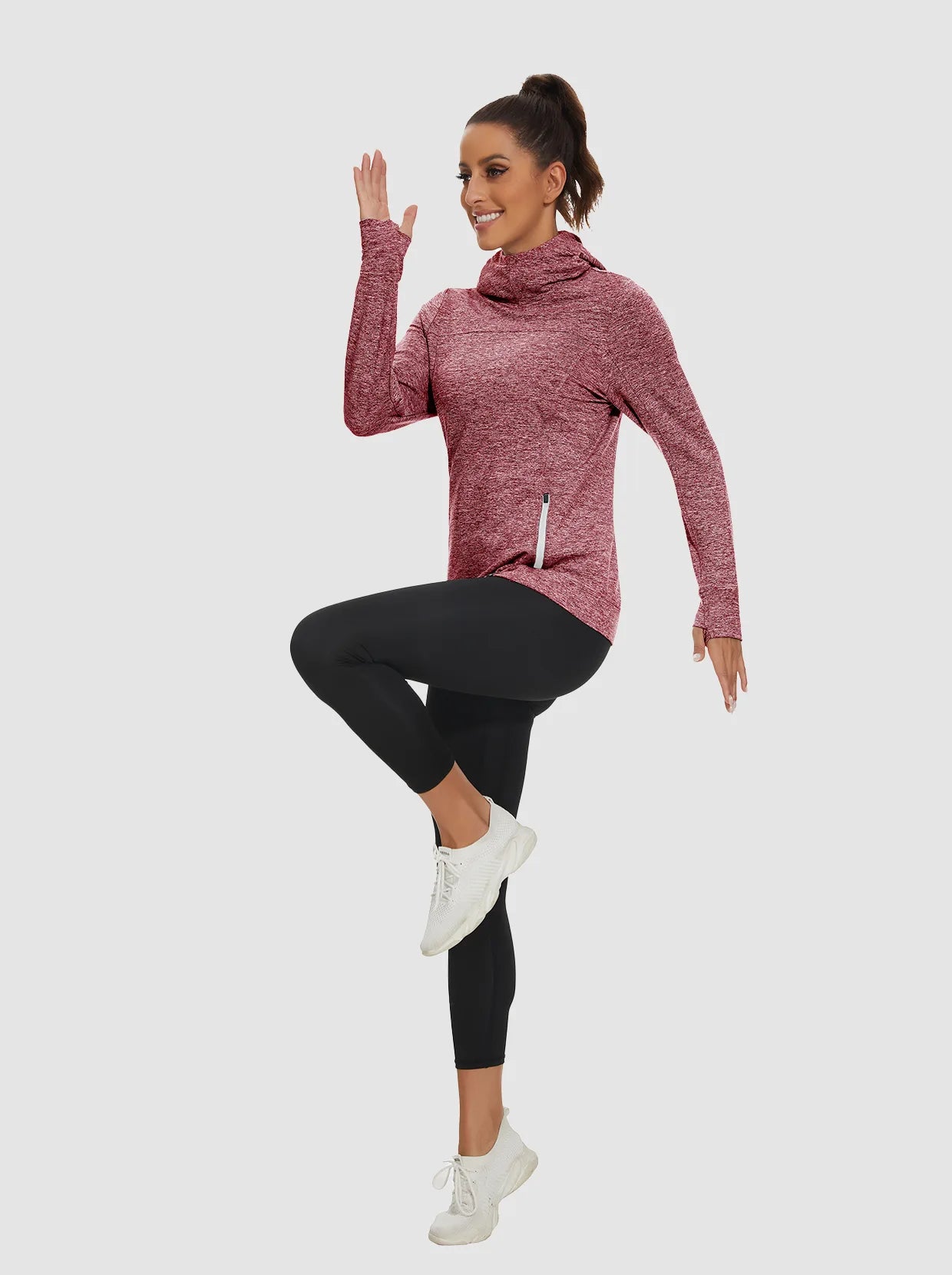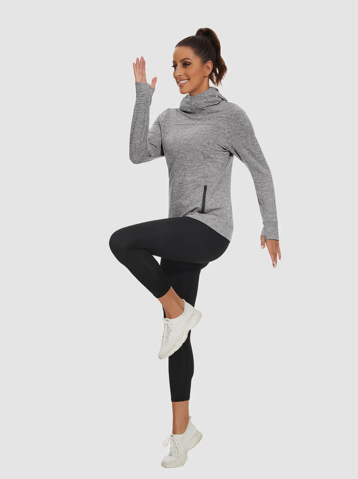 Stay warm and protected with our black thermal hooded top. Featuring a 4-way stretch and moisture-wicking fabric, it's perfect for skiing or other winter sports. With thumb holes and a zipper kangaroo pocket, you can store the small thing, like your phone. From workouts to winter adventures, this versatile hoodie keeps you cozy.