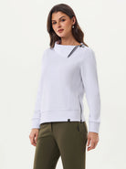 Rock your game in this white stand-collar sweatshirt. The clever side-zip neckline lets you dial in your perfect temperature, while the matching side hem zipper makes transitions seamless. Ribbed cuffs and hem keep everything snug and structured, so you stay focused on your swing, not your fit. The moisture-wicking blend of cotton, polyester, and elastane works overtime to keep you dry whether you're on the golf course, tennis court, or just living your best life.