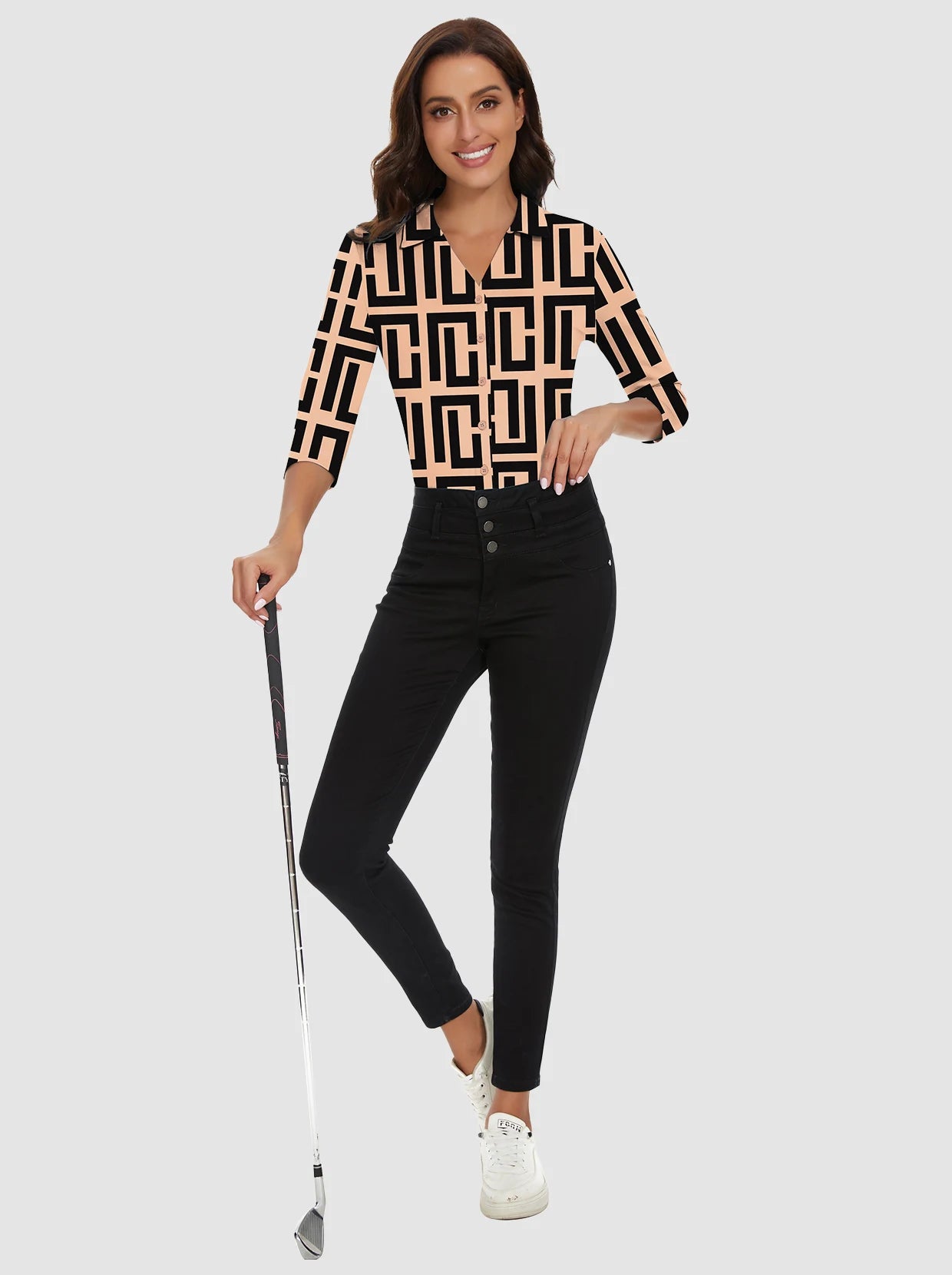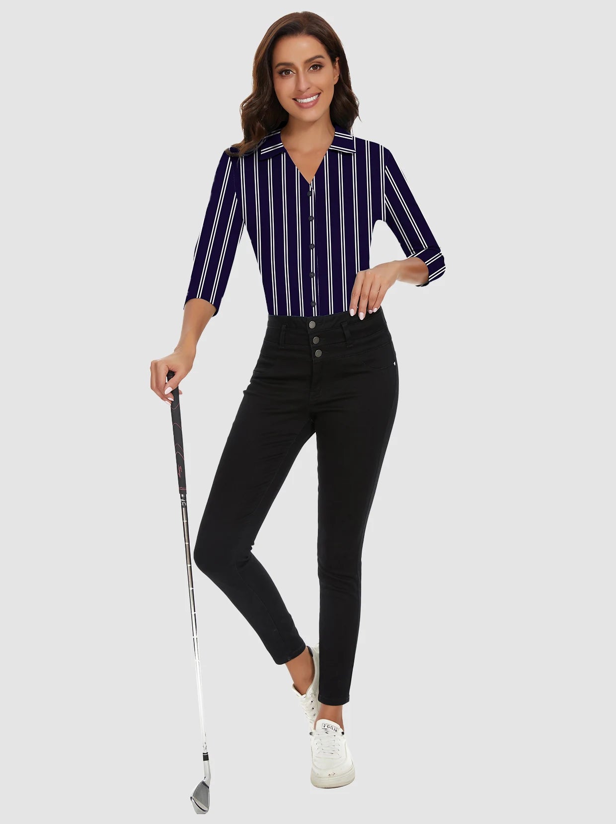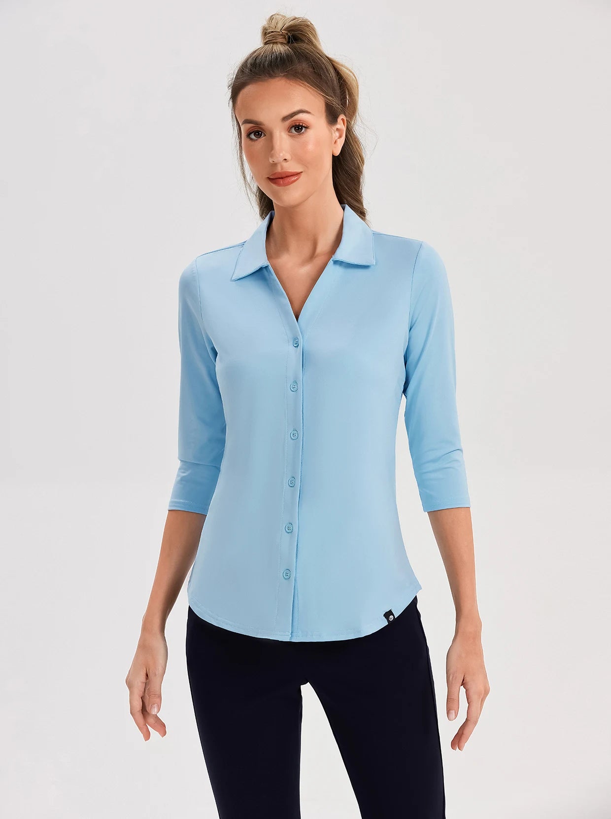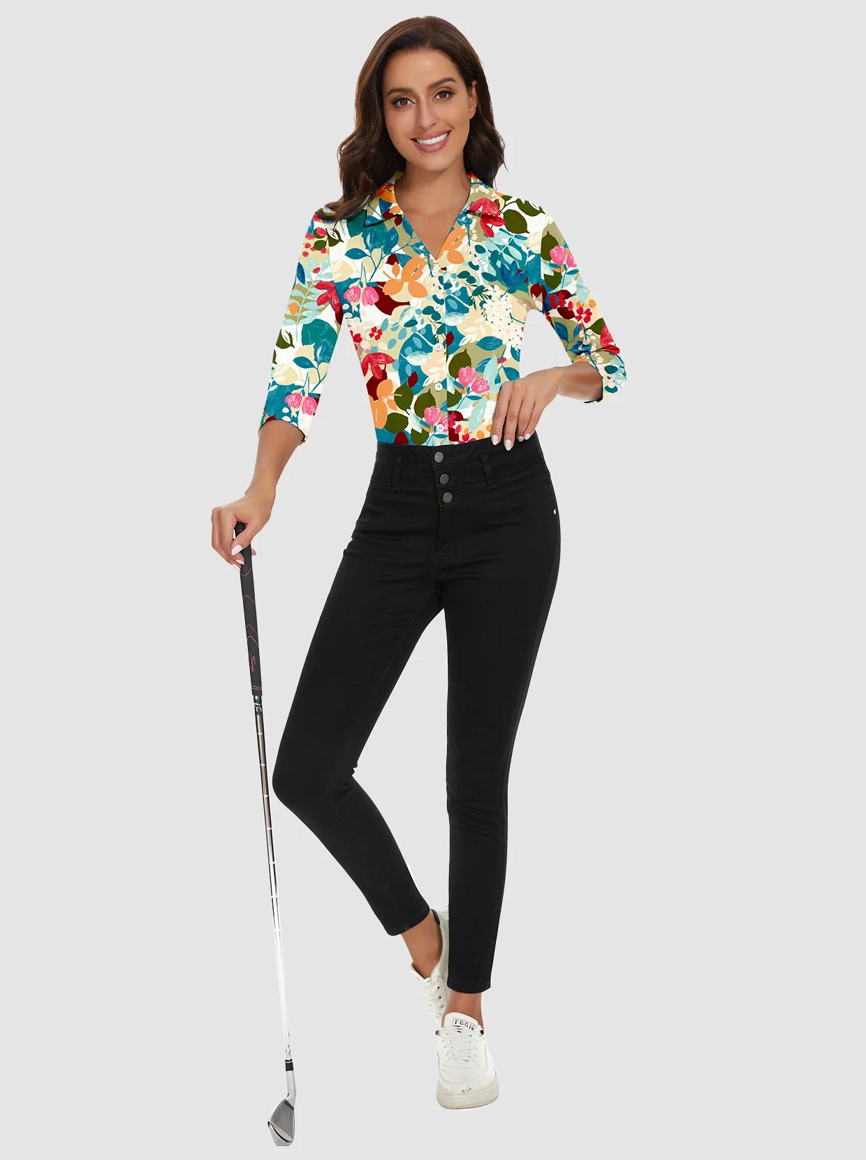 Discover the allure of Soneven's stylish 3/4 length sleeve golf shirts for women. Offering comfortable coverage for ample sun protection, these shirts are designed to elevate your golf game. With elegant and feminine designs, along with trendy prints, they add a playful touch to your golf outfits. V-neck button-down shirts, also perfect for daily wear, are easy to pair with straight long skirts and jeans.