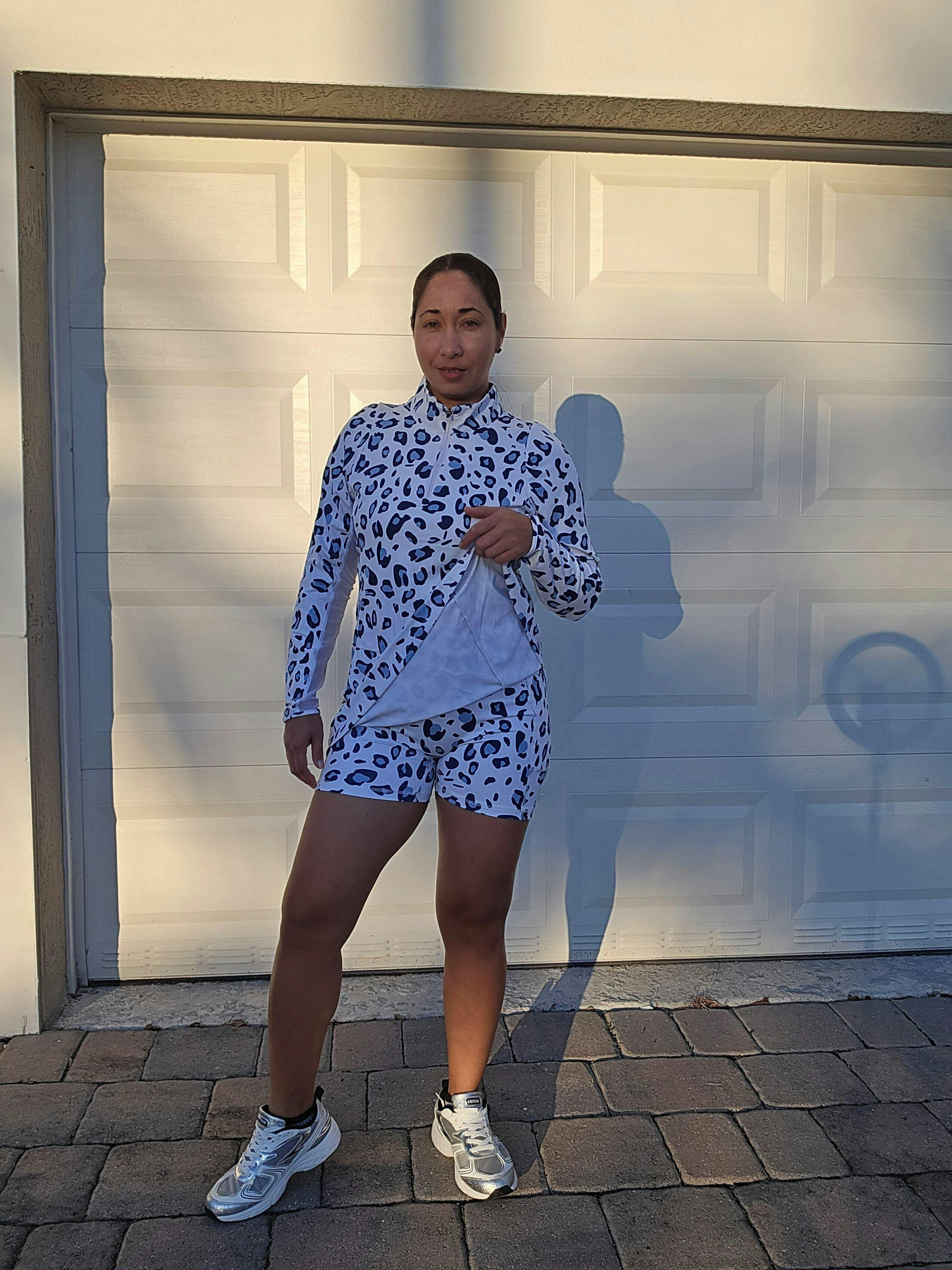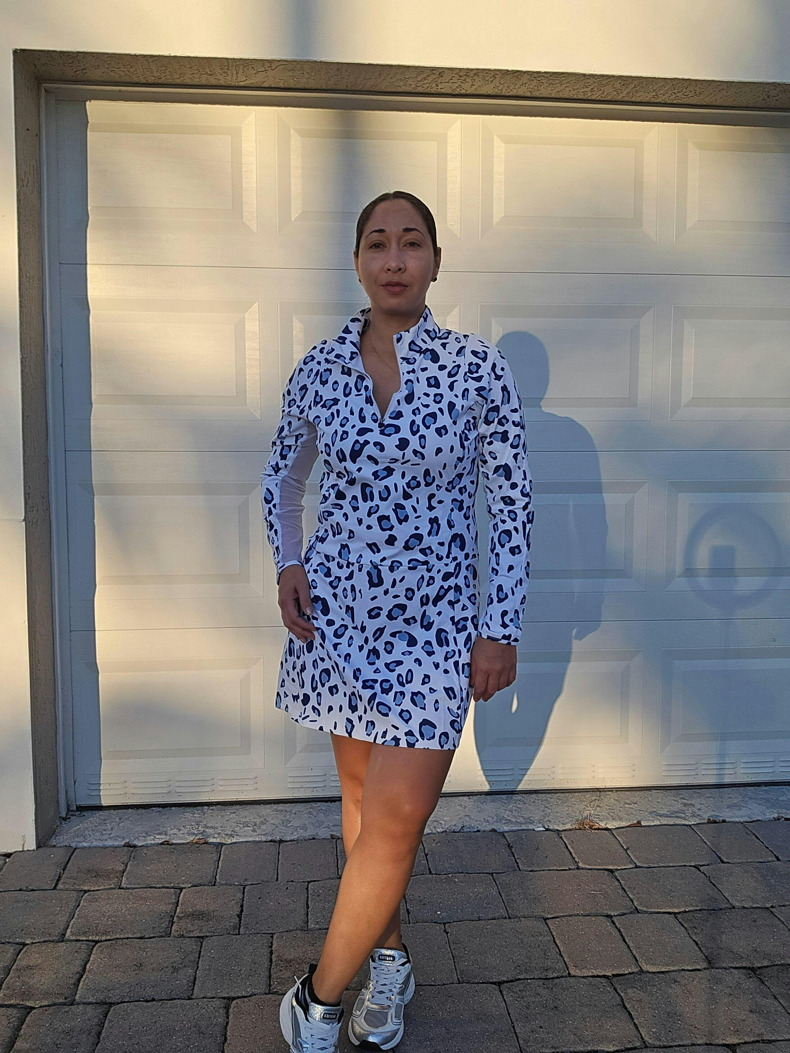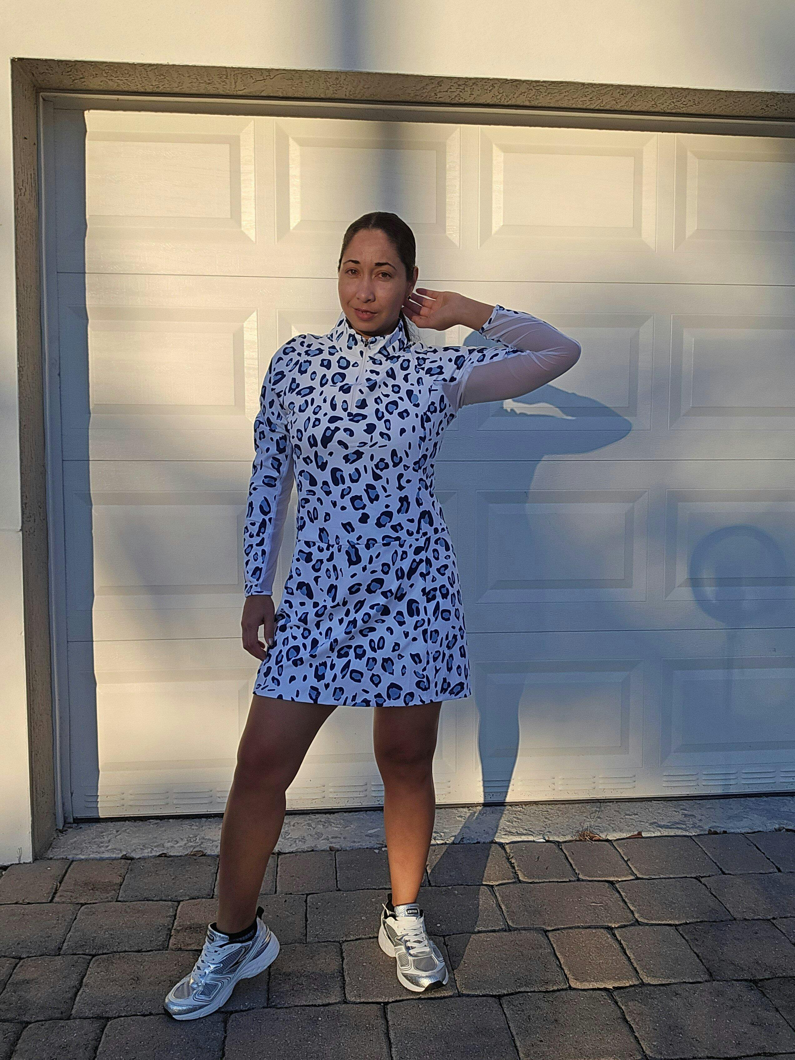 Bye-bye, sweaty arms! Featuring unique half-mesh sleeves, you can wave goodbye to sweaty arms and embrace all-day freshness. This long-sleeve dress features a bold leopard print on stretchy, breathable fabric for ultimate comfort. Designed with half-mesh sleeves, pockets, and built-in shorts, it's your go-to for golf, tennis, pickleball, or simply turning heads wherever you go.