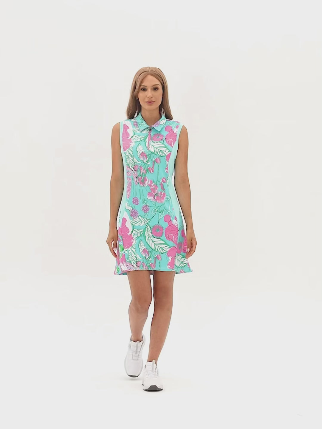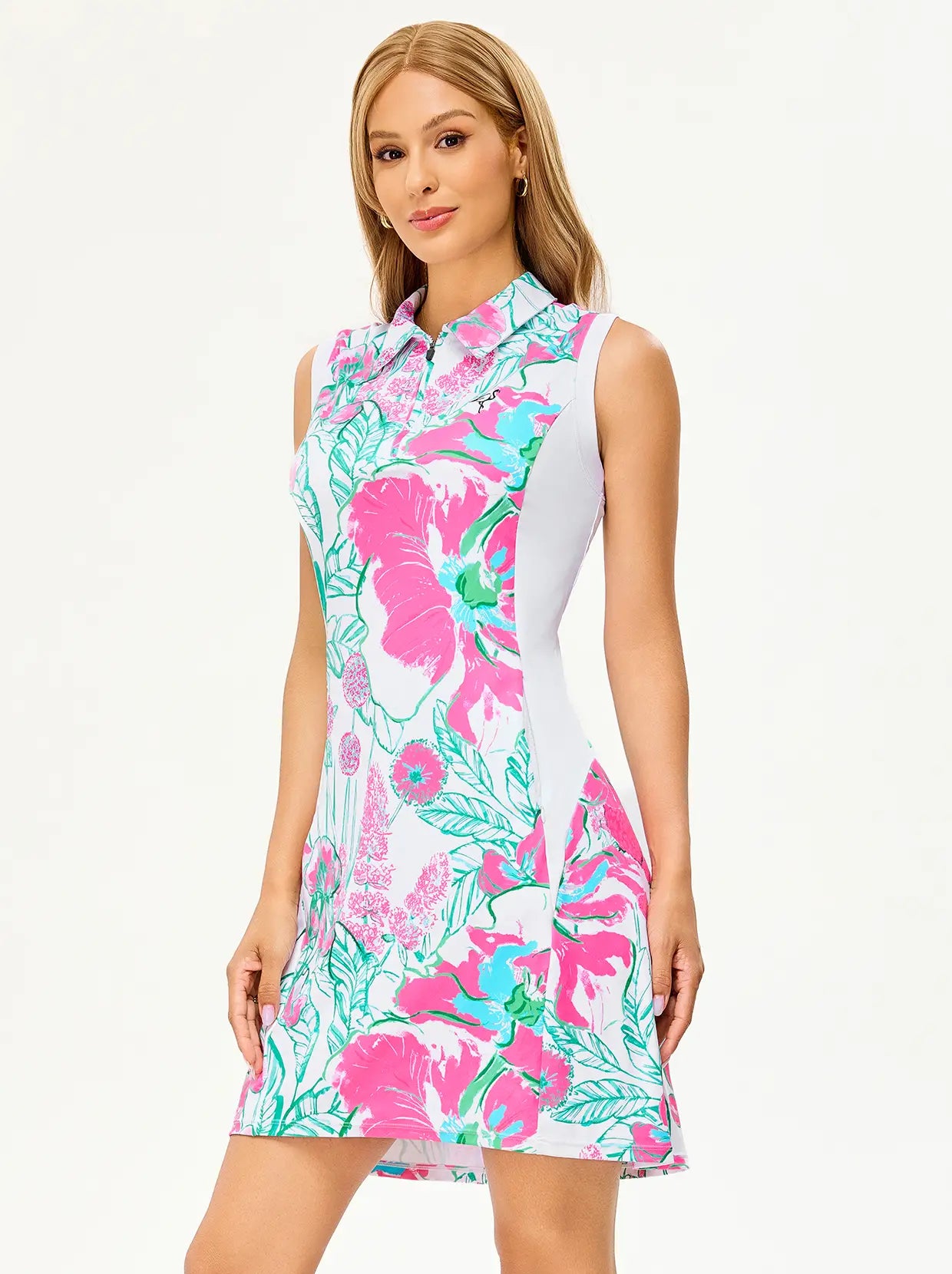 Part of our Awaken in Bloom Collection, this sleeveless polo dress combines style with serious performance. The 4-way stretch fabric gives you unrestricted movement for every activity, while the invisible quarter-zip lets you adjust airflow. Dual side zipper pockets keep your essentials secure, and the sleeveless silhouette maximizes cooling and mobility.
