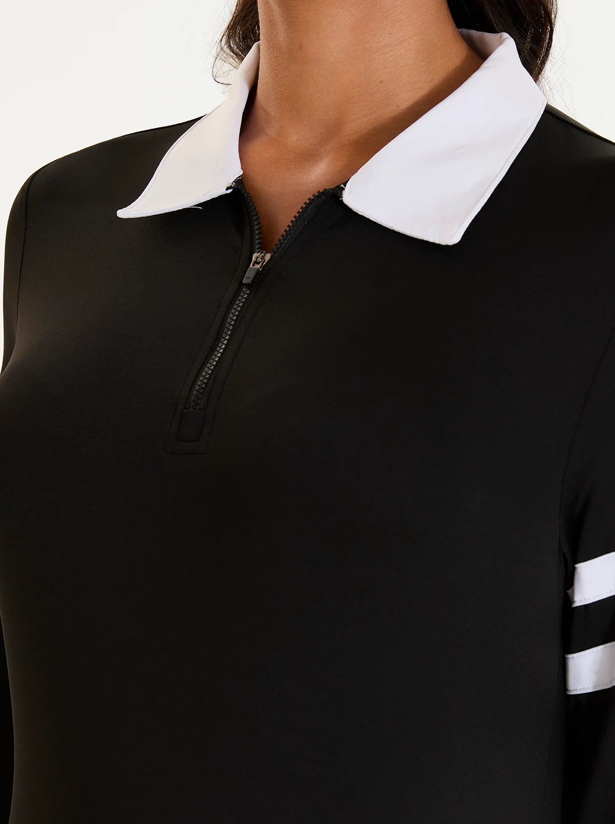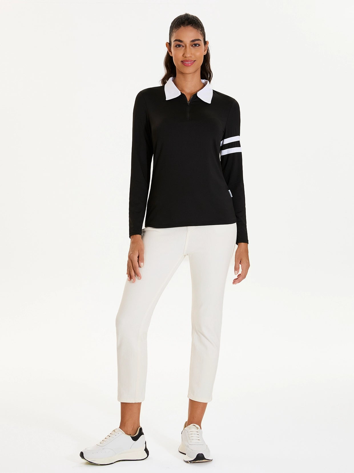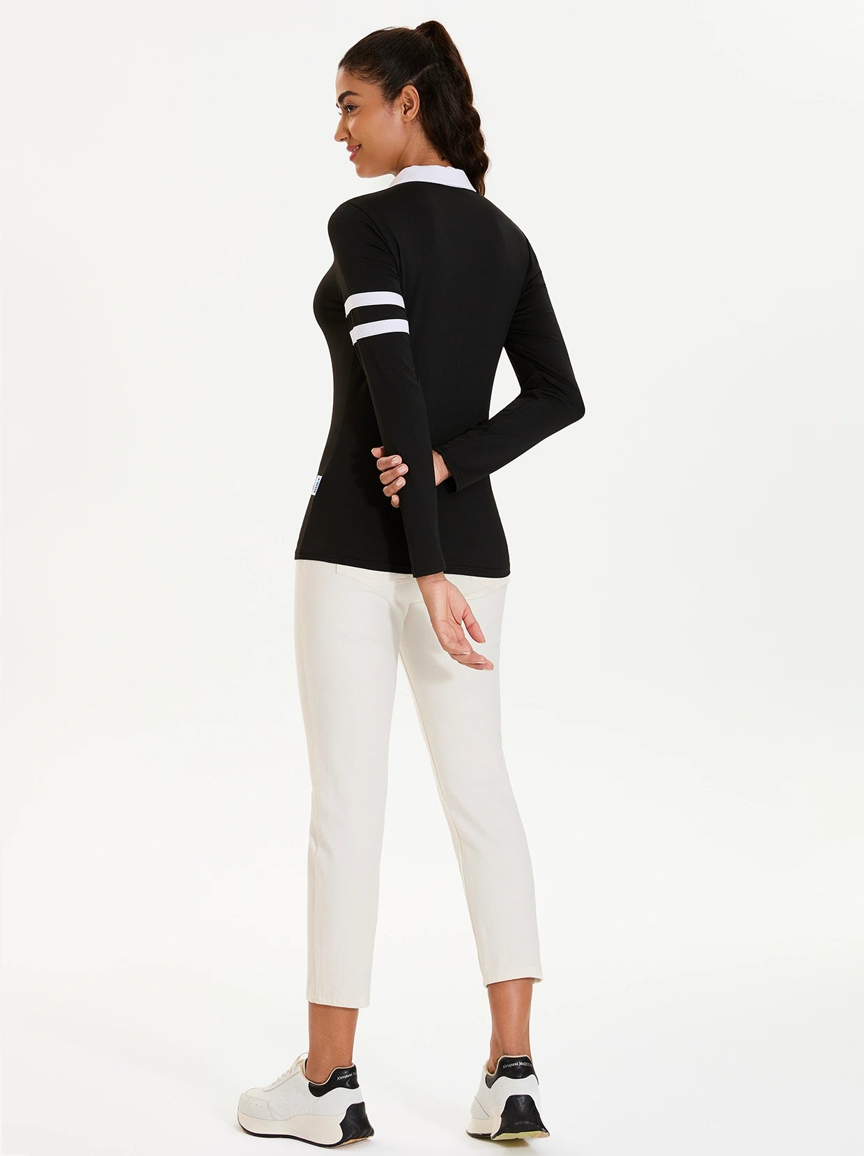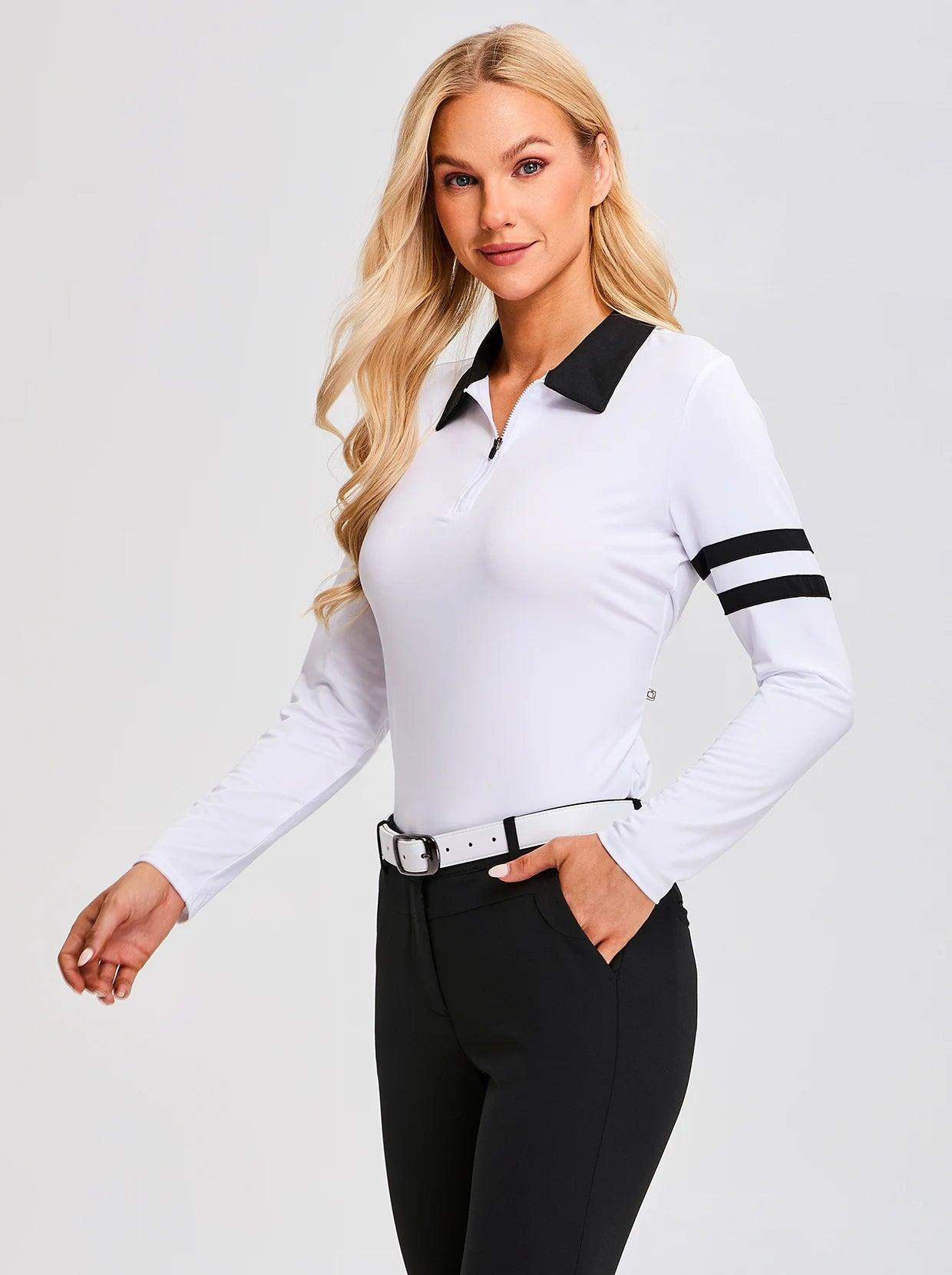 A quarter zip women’s top stands out from other golf tops due to its adjustable neckline. Unlike traditional crew-neck or polo shirts, the zipper allows for better ventilation, giving you control over how much airflow you need based on the weather. This makes the golf quarter zip ideal for varying conditions, as you can zip it up to retain warmth or unzip it to cool down. The quarter zip also offers a more athletic, sleek look compared to standard polo-style golf shirts.