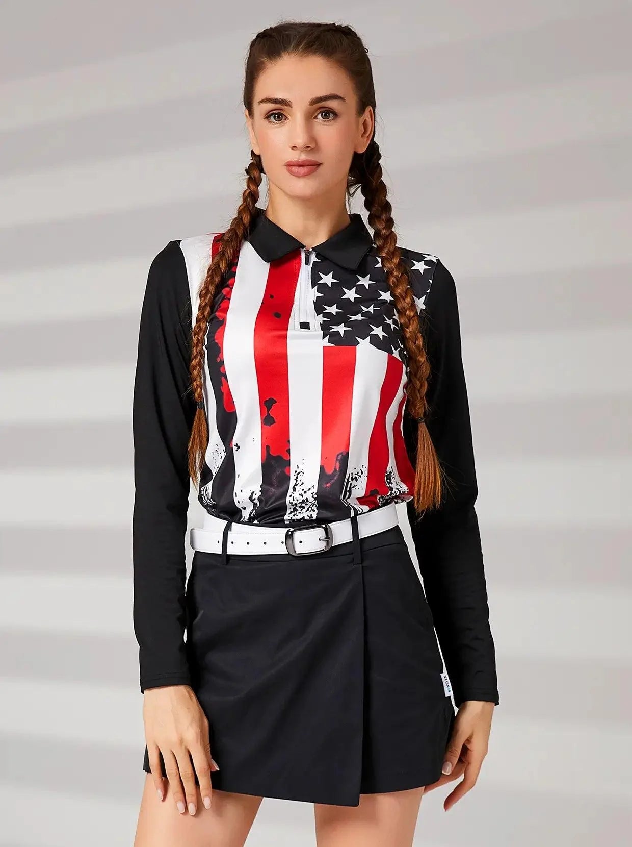 Flag Pattern Long-sleeve Golf Quarterzip Polo Shirt