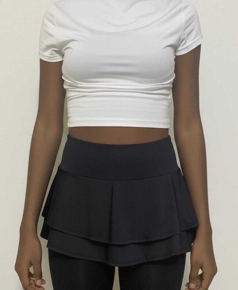 Enjoy your tennis time with our black athletic skirted leggings. Crafted from soft, breathable, and stretchy fabric, these leggings offer superior comfort and moisture-wicking performance. The double layer provides both coverage and flair, while the side pockets keep your essentials within reach. The wide, flat waistband ensures a secure and comfortable fit.