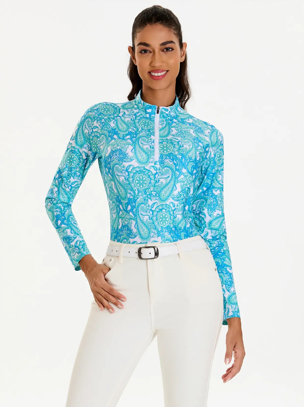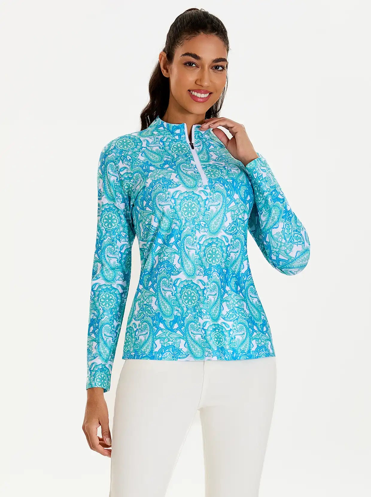 A dynamic and versatile shirt that's perfect for any occasion. With UPF50+ protection, moisture-wicking technology, and 4-way stretch fabric, you can stay cool, dry, and protected while looking stylish in the eye-catching green paisley print. From the golf course to the tennis court to your daily activities, this shirt has got you covered. And with its streamlined fit and durable fabric, you'll feel comfortable and confident all day long. Evaluate your game in style with this green paisley quarter-zip polo shirt.