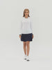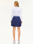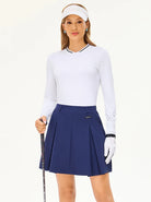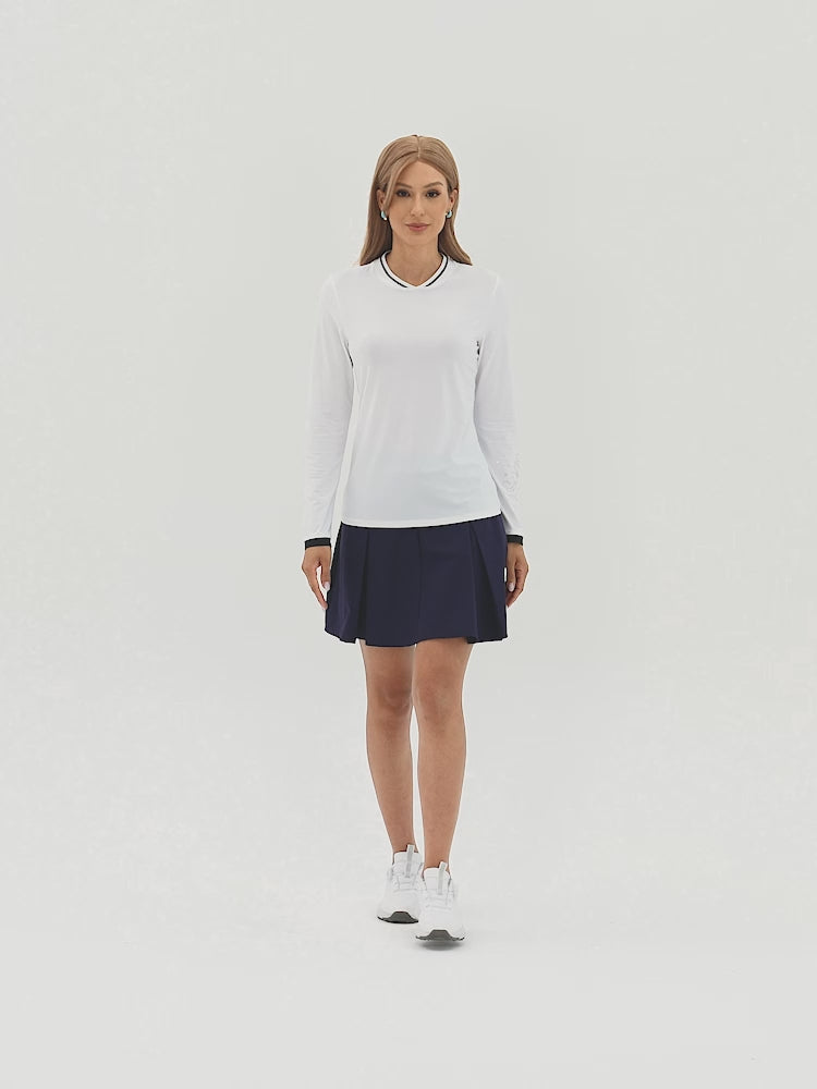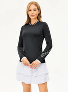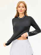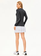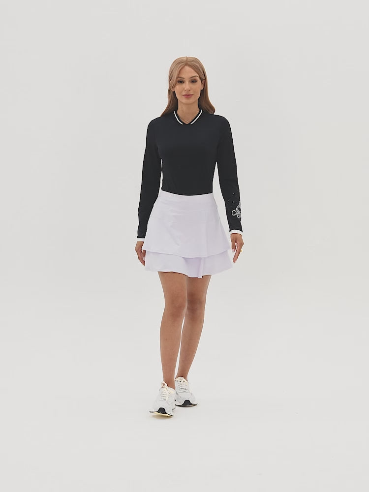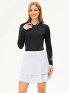 Sparkle and perform in this chic long-sleeve base layer from our Love at First Swing Collection. The hot-fix rhinestone design brings the glamour while the ribbed, curved collar molds to your neck for a secure, irritation-free fit. Armed with UPF50+ and cooling fabric technology, you'll stay protected and refreshed through those long outdoor sessions. The bold black-and-white color-block aesthetic delivers timeless athletic style. Your new go-to for tennis, golf, pickleball, and beyond.