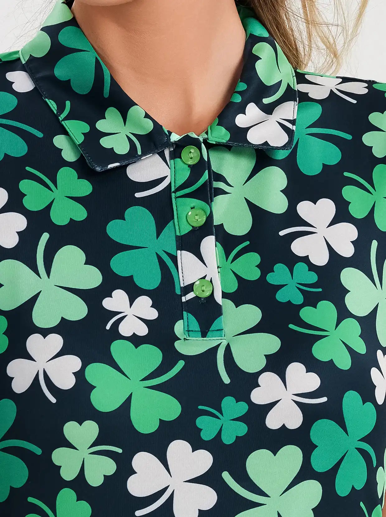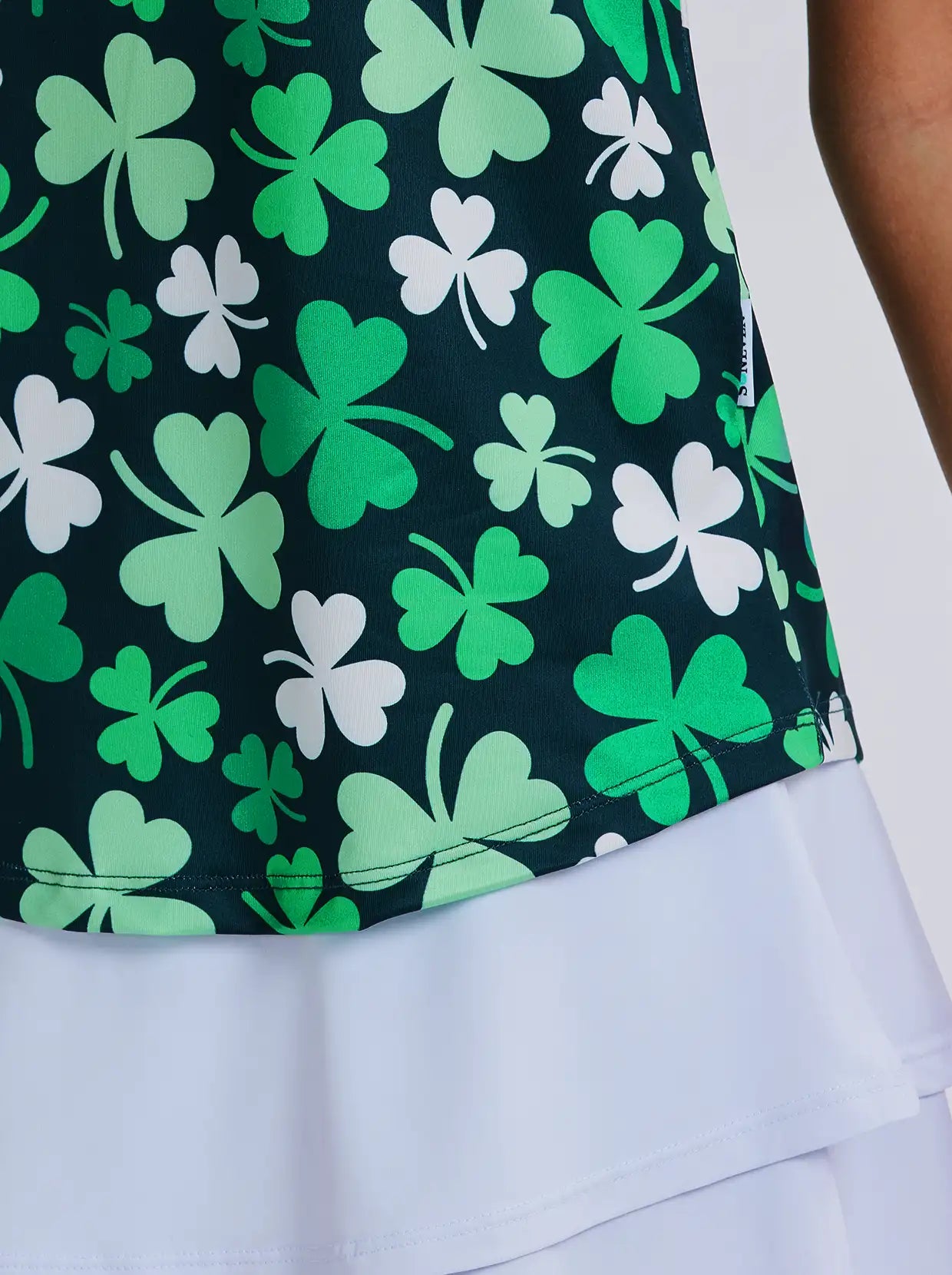 Celebrate St. Patrick's Day in style with our Green Shamrock Ruffled Sleeveless Polo. The breathable and moisture-wicking fabric will keep you comfortable all day, while the 4-way stretch and soft material ensure a perfect fit. The classic button placket and green shamrock add a touch of festive flair. Perfect for parades, parties, and more!