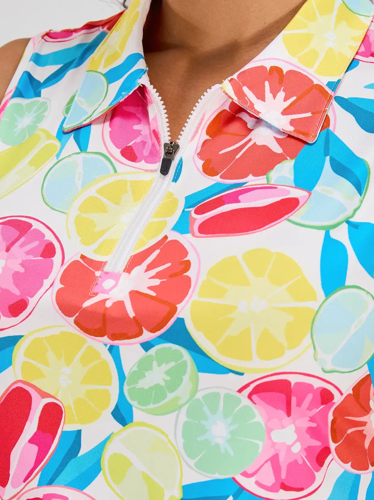 Perfect for taking on any challenge! Crafted with a moisture-wicking fabric, you'll stay cool and dry. The vibrant colors and fruit pattern add a touch of fun to your wardrobe, making it ideal for daily wear as well. And with a sleeveless, quarter-zip design, you'll have complete freedom of movement for maximum performance.