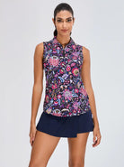 Colorful Flower Quarter-zip Sleeveless Polo Shirt for Ladies