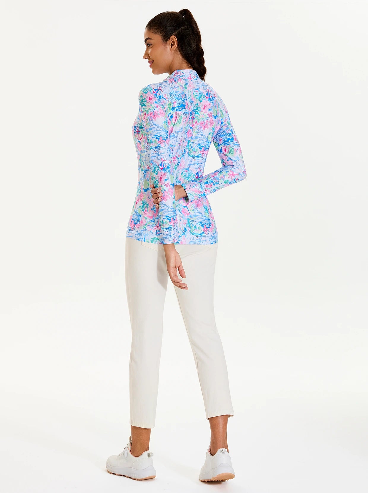 Embrace a vibrant spring day with our Pink & Blue Spring Scenery Quarter-Zip Top! This charming top features a delightful print of flamingos. It blends style with practical features: raglan sleeves and stretch material ensure a wide range of motion, while moisture-wicking fabric keeps you cool and comfortable. Crafted with a stand collar and quarter-zip, it's perfect for golf, tennis, and pickleball. Its versatile look also makes it ideal for everyday casual wear.