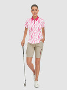 This golf polo features a playful pink and blue checkerboard design with a convenient quarter-zip feature, making it perfect for a round on the course. Stand out from the crowd with this fun and functional top, designed for comfort and style.