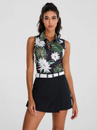 Hawaii is here! Step into paradise with our stylish and functional Hawaiian-inspired polo shirts. This sleeveless top features a vibrant floral and palm leaf print that's perfect for sunny days on the green or at the beach. The sleeveless design ensures maximum movement and airflow, while the breathable fabric keeps you cool and comfortable. The versatile design pairs effortlessly with skirts, skinny jeans, or shorts, making it a must-have for any tropical wardrobe.